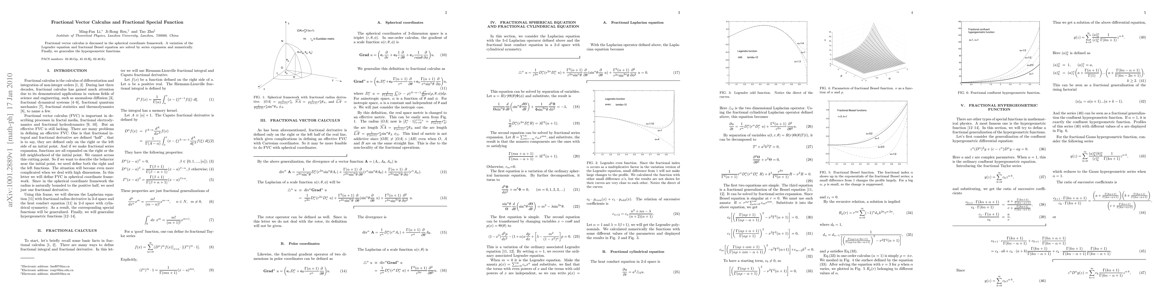 Summary: This paper explores fractional vector calculus in the spherical coordinate system, solving fractional versions of the Legendre and Bessel equations through series expansion and numerical methods. It also generalizes the hypergeometric functions.