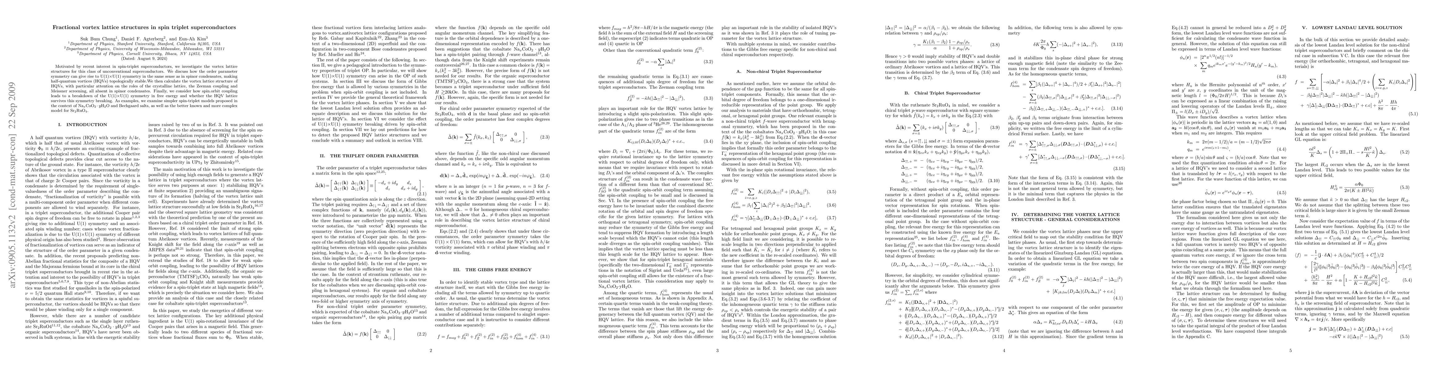 This paper explores fractional vortex lattice structures in spin triplet superconductors, focusing on the topological stability of half-quantum vortices (HQV) due to U(1)×U(1) symmetry. It examines the impact of crystalline lattice, Zeeman coupling, and Meissner screening on HQV lattices, and investigates the effects of spin-orbit coupling on the symmetry breaking and survival of HQV lattices in models like NaxCoO2·yH2O, Bechgaard salts, and Sr2RuO4.