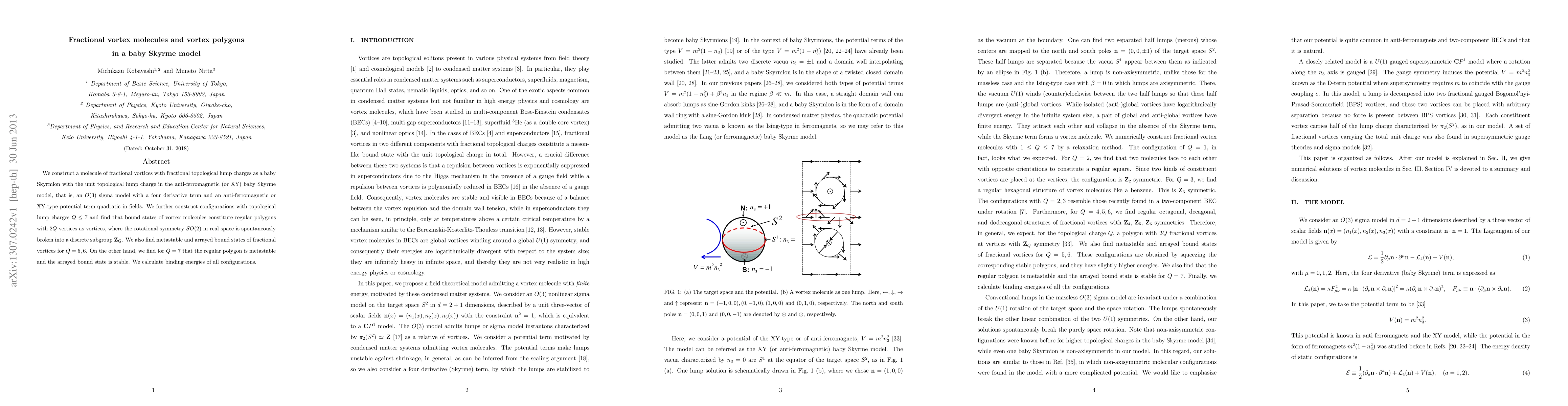 This paper constructs fractional vortex molecules in a baby Skyrme model, demonstrating that bound states form regular polygons with rotational symmetry spontaneously broken into a discrete subgroup. It also investigates metastable and stable configurations for different topological lump charges, calculating their binding energies.