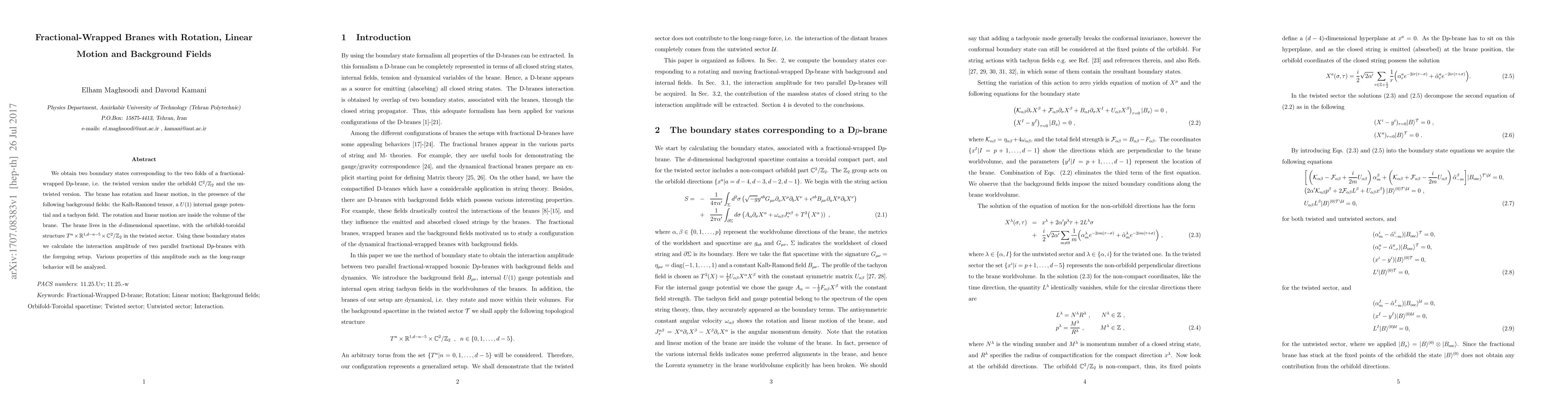We obtain two boundary states corresponding to the two folds of a fractional-wrapped D$p$-brane, i.e. the twisted version under the orbifold $\mathbb{C}^{2}/\mathbb{Z}_{2}$ and the untwisted version. The brane has rotation and linear motion, in the presence of the following background fields: the Kalb-Ramond tensor, a $U(1)$ internal gauge potential and a tachyon field. The rotation and linear motion are inside the volume of the brane. The brane lives in the $d$-dimensional spacetime, with the orbifold-toroidal structure $T^n \times \mathbb{R}^{1, d-n-5} \times\mathbb{C}^{2}/\mathbb{Z}_{2}$ in the twisted sector. Using these boundary states we calculate the interaction amplitude of two parallel fractional D$p$-branes with the foregoing setup. Various properties of this amplitude such as the long-range behavior will be analyzed.