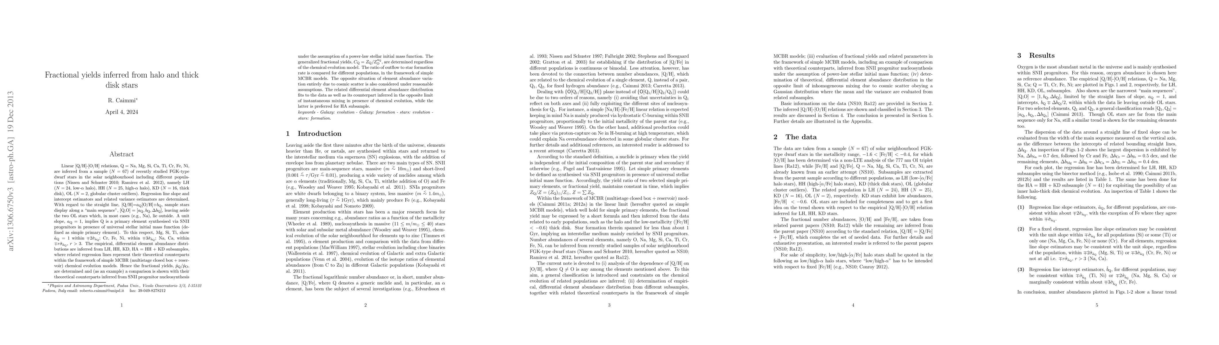 Linear [Q/H]-[O/H] relations, Q = Na, Mg, Si, Ca, Ti, Cr, Fe, Ni, are inferred from a sample (N=67) of recently studied FGK-type dwarf stars in the solar neighbourhood including different populations. Regression line slope and intercept estimators and related variance estimators are determined. With regard to the straight line, [Q/H] = aQ [O/H] + bQ, sample stars display along a "main sequence", [Q,O] = [aQ,bQ, Delta bQ], leaving aside the two OL stars which, in most cases (e.g., Na), lie outside. A unit slope, aQ = 1, implies Q is a primary element synthesised via SNII progenitors in presence of universal stellar initial mass function (defined as simple primary element). To this respect, Mg, Si, Ti, show aQ = 1 within 2 sigma(aQ); Cr, Fe, Ni, within 3 sigma(aQ); Na, Ca, exceeding 3 sigma(aQ). The empirical, differential element abundance distributions are inferred from different subsamples, where related regression lines represent their theoretical counterparts within the framework of simple MCBR (multistage closed box + reservoir) chemical evolution models. Hence the fractional yields are determined and (as an example) a comparison is shown with their theoretical counterparts inferred from SNII progenitor nucleosynthesis under the assumption of a power-law stellar initial mass function. The generalized fractional yields are determined regardless from the chemical evolution model. The ratio of outflow to star formation rate is compared for different populations, in the framework of simple MCBR models. The opposite situation of element abundance variation entirely due to cosmic scatter is also considered under reasonable assumptions. The related differential element abundance distribution fits to the data as well as its counterpart inferred in the opposite limit of instantaneous mixing in presence of chemical evolution.