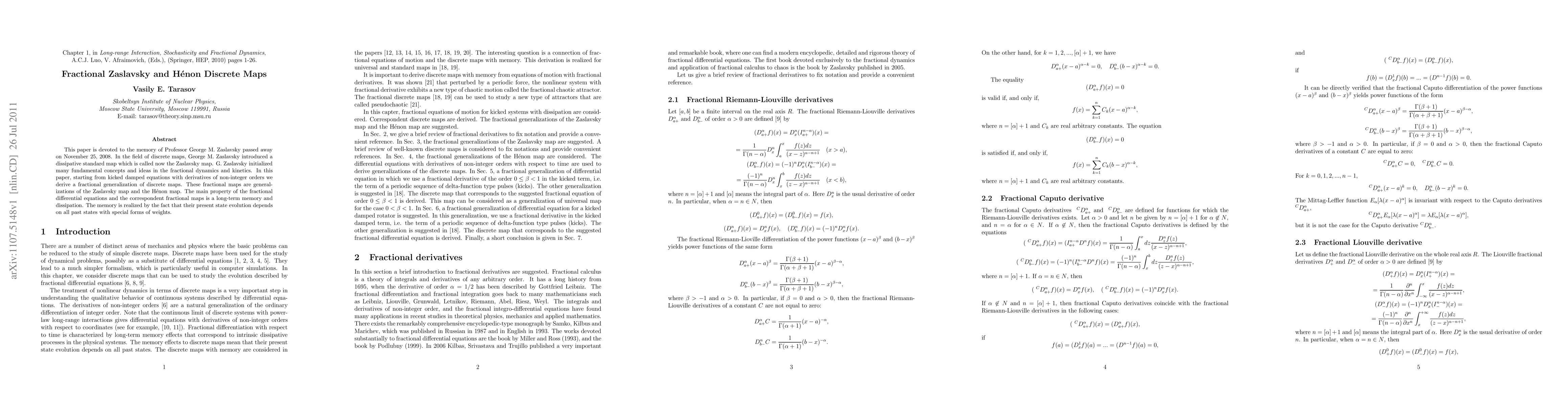 This paper is devoted to the memory of Professor George M. Zaslavsky passed away on November 25, 2008. In the field of discrete maps, George M. Zaslavsky introduced a dissipative standard map which is called now the Zaslavsky map. G. Zaslavsky initialized many fundamental concepts and ideas in the fractional dynamics and kinetics. In this paper, starting from kicked damped equations with derivatives of non-integer orders we derive a fractional generalization of discrete maps. These fractional maps are generalizations of the Zaslavsky map and the Henon map. The main property of the fractional differential equations and the correspondent fractional maps is a long-term memory and dissipation. The memory is realized by the fact that their present state evolution depends on all past states with special forms of weights.