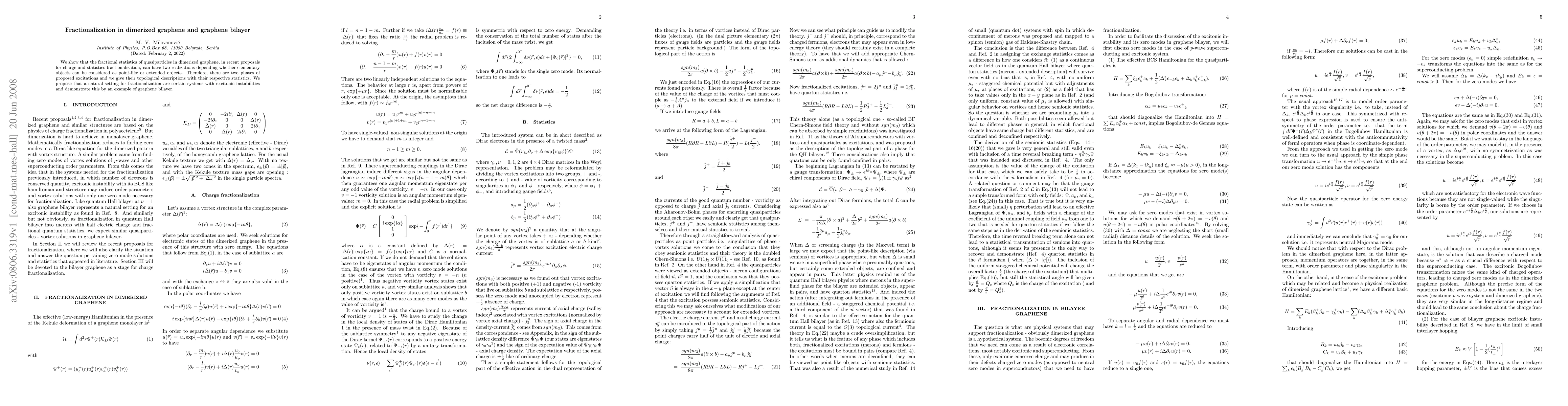 Summary: The paper explores the fractional statistics of quasiparticles in dimerized graphene and graphene bilayer, identifying two distinct phases based on whether the elementary objects are point-like or extended. It provides topological descriptions and proposes that systems with excitonic instabilities, such as graphene bilayer, are natural settings for such fractionalization.