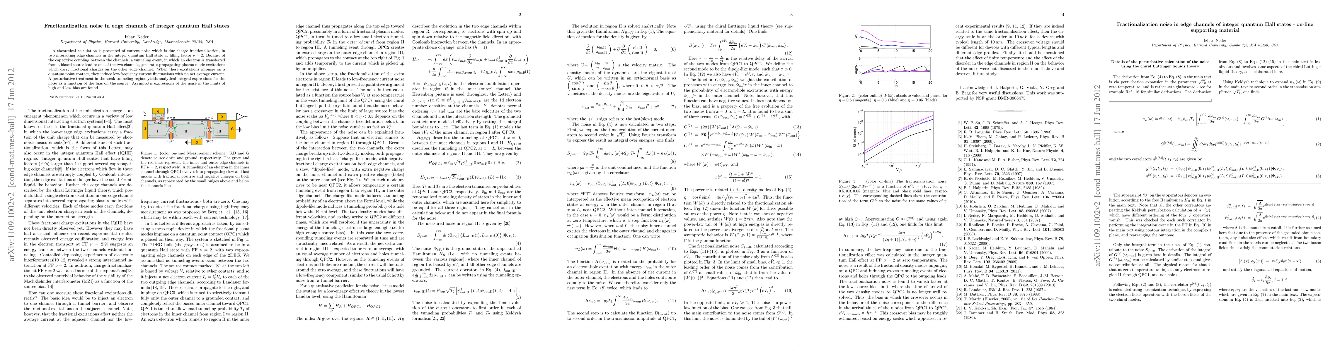 This paper theoretically investigates current noise in two interacting edge channels of the integer quantum Hall state at filling factor ν=2, attributing it to charge fractionalization. It finds that tunneling events generate plasma mode excitations that induce low-frequency current fluctuations without net average current, providing analytical expressions for the noise under weak tunneling conditions.