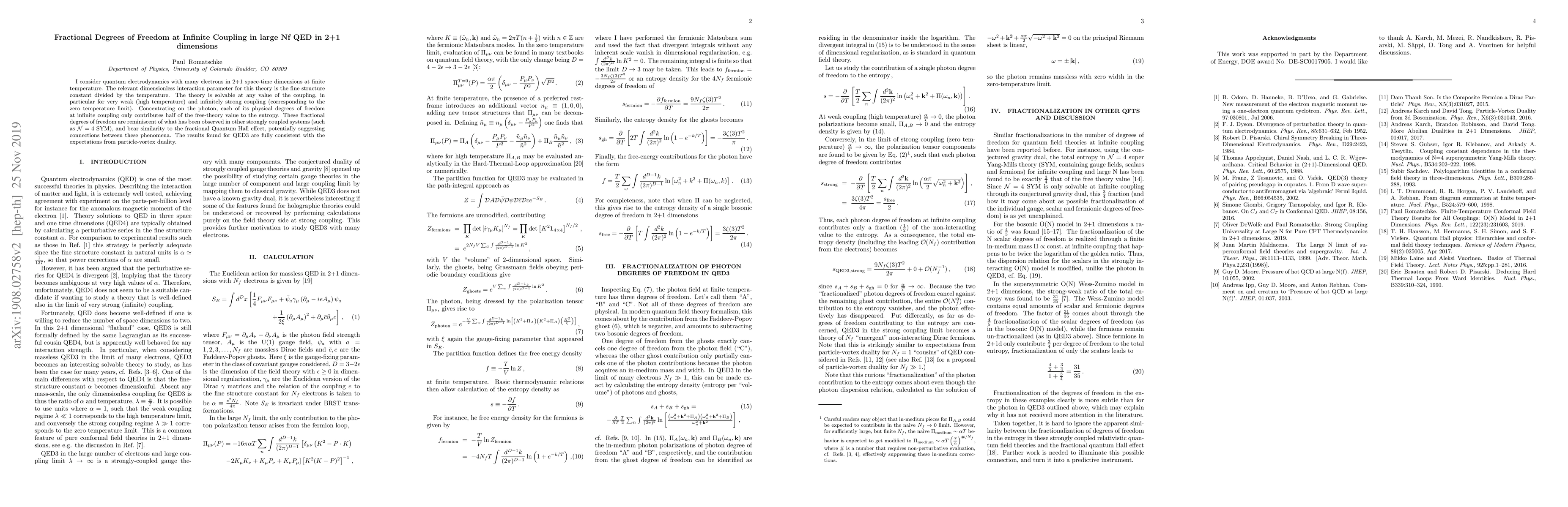 I consider quantum electrodynamics with many electrons in 2+1 space-time dimensions at finite temperature. The relevant dimensionless interaction parameter for this theory is the fine structure constant divided by the temperature. The theory is solvable at any value of the coupling, in particular for very weak (high temperature) and infinitely strong coupling (corresponding to the zero temperature limit). Concentrating on the photon, each of its physical degrees of freedom at infinite coupling only contributes half of the free-theory value to the entropy. These fractional degrees of freedom are reminiscent of what has been observed in other strongly coupled systems (such as N=4 SYM), and bear similarity to the fractional Quantum Hall effect, potentially suggesting connections between these phenomena. The results found for QED3 are fully consistent with the expectations from particle-vortex duality.