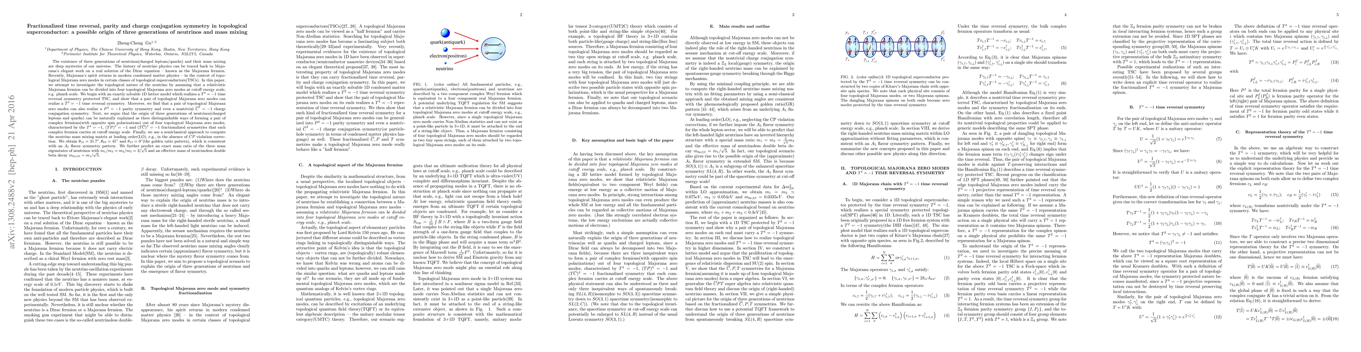 This paper explores the topological Majorana zero modes in topological superconductors to explain the three generations of neutrinos and their mass mixing. It proposes that these modes can realize fractionalized symmetries, leading to a natural explanation for the three neutrino generations and predicts specific mass mixing angles and mass ratios consistent with observed patterns.