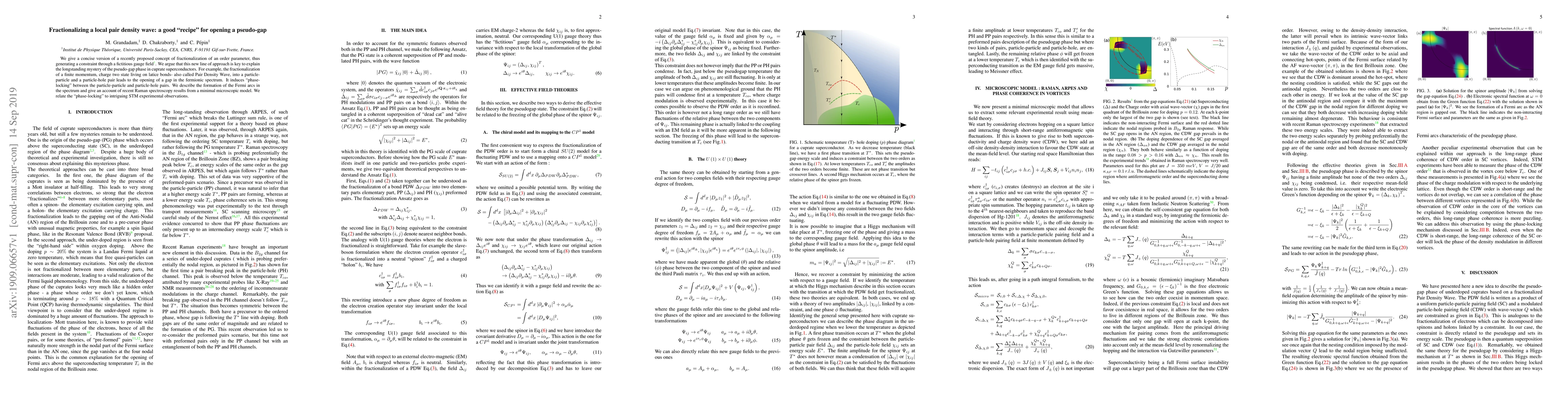 We give a concise version of a recently proposed concept of fractionalization of an order parameter, thus generating a constraint through a fictitious gauge field. We argue that this new line of approach is key to explain the longstanding mystery of the pseudo-gap phase in cuprate superconductors. For example, the fractionalization of a finite momentum, charge two state living on latice bonds -- also called Pair Density Wave, into a particle-particle and a particle-hole pair leads to the opening of a gap in the fermionic spectrum. It induces "phase-locking" between the particle-particle and particle-hole pairs. We describe the formation of the Fermi arcs in the spectrum and give an account of recent Raman spectroscopy results from a minimal microscopic model. We relate the "phase-locking" to intriguing STM experimental observations.