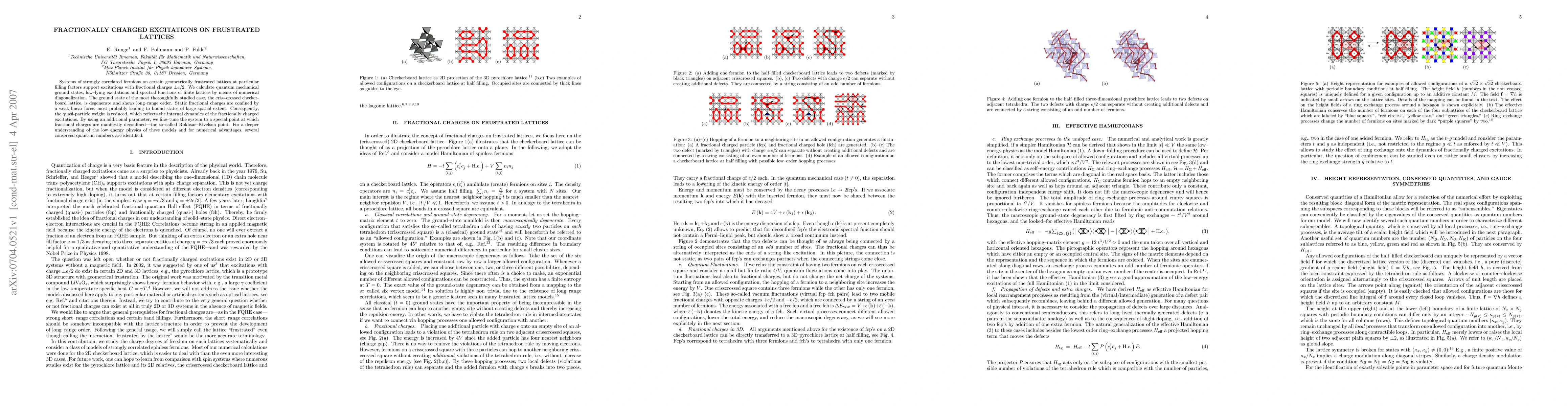 Systems of strongly correlated fermions on certain geometrically frustrated lattices at particular filling factors support excitations with fractional charges $\pm e/2$. We calculate quantum mechanical ground states, low--lying excitations and spectral functions of finite lattices by means of numerical diagonalization. The ground state of the most thoroughfully studied case, the criss-crossed checkerboard lattice, is degenerate and shows long--range order. Static fractional charges are confined by a weak linear force, most probably leading to bound states of large spatial extent. Consequently, the quasi-particle weight is reduced, which reflects the internal dynamics of the fractionally charged excitations. By using an additional parameter, we fine--tune the system to a special point at which fractional charges are manifestly deconfined--the so--called Rokhsar--Kivelson point. For a deeper understanding of the low--energy physics of these models and for numerical advantages, several conserved quantum numbers are identified.