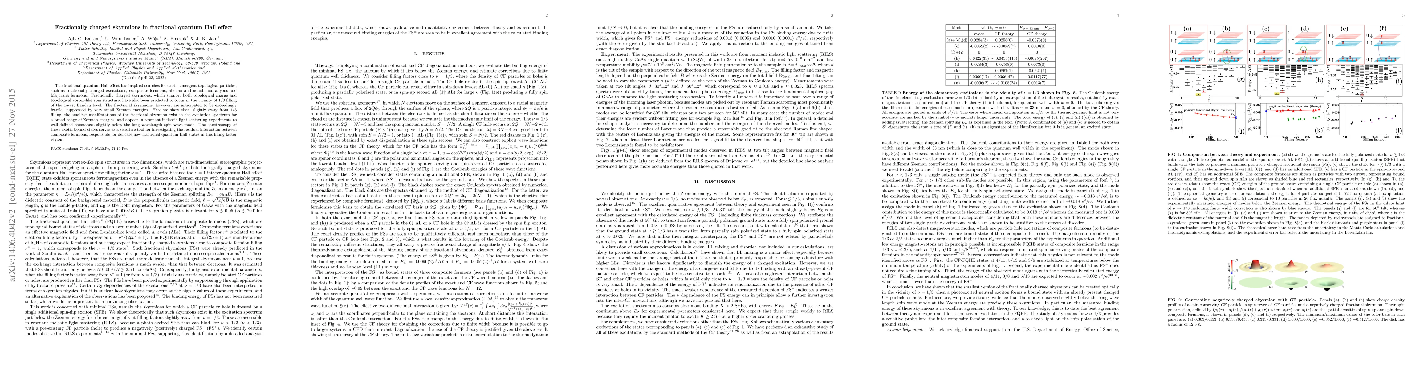 The fractional quantum Hall effect has inspired searches for exotic emergent topological particles, such as fractionally charged excitations, composite fermions, abelian and nonabelian anyons and Majorana fermions. Fractionally charged skyrmions, which support both topological charge and topological vortex-like spin structure, have also been predicted to occur in the vicinity of 1/3 filling of the lowest Landau level. The fractional skyrmions, however, are anticipated to be exceedingly fragile, suppressed by very small Zeeman energies. Here we show that, slightly away from 1/3 filling, the smallest manifestations of the fractional skyrmion exist in the excitation spectrum for a broad range of Zeeman energies, and appear in resonant inelastic light scattering experiments as well-defined resonances slightly below the long wavelength spin wave mode. The spectroscopy of these exotic bound states serves as a sensitive tool for investigating the residual interaction between composite fermions, responsible for delicate new fractional quantum Hall states in this filling factor region.