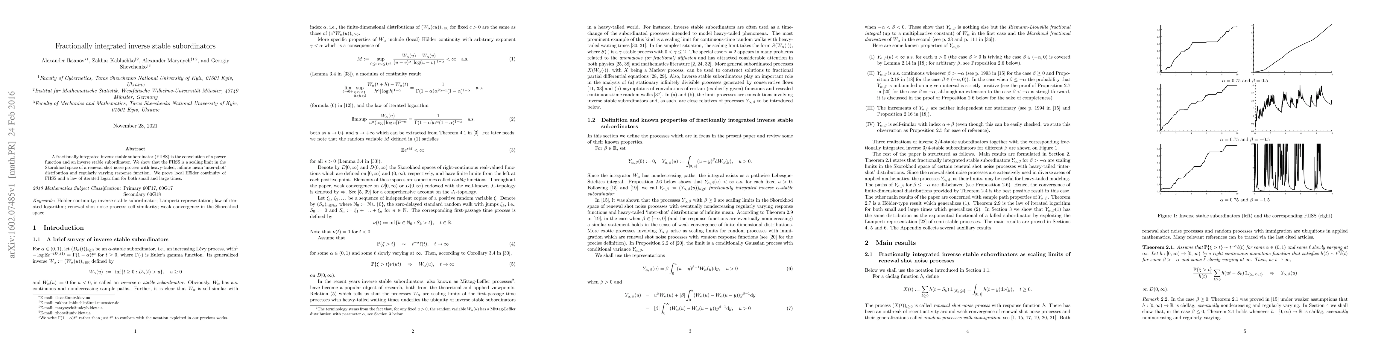 A new process called Fractionally Integrated Inverse Stable Subordinator (FIISS) is shown to be a scaling limit of a renewal shot noise process with heavy-tailed distributions, exhibiting local H"{o}lder continuity and a law of iterated logarithm.