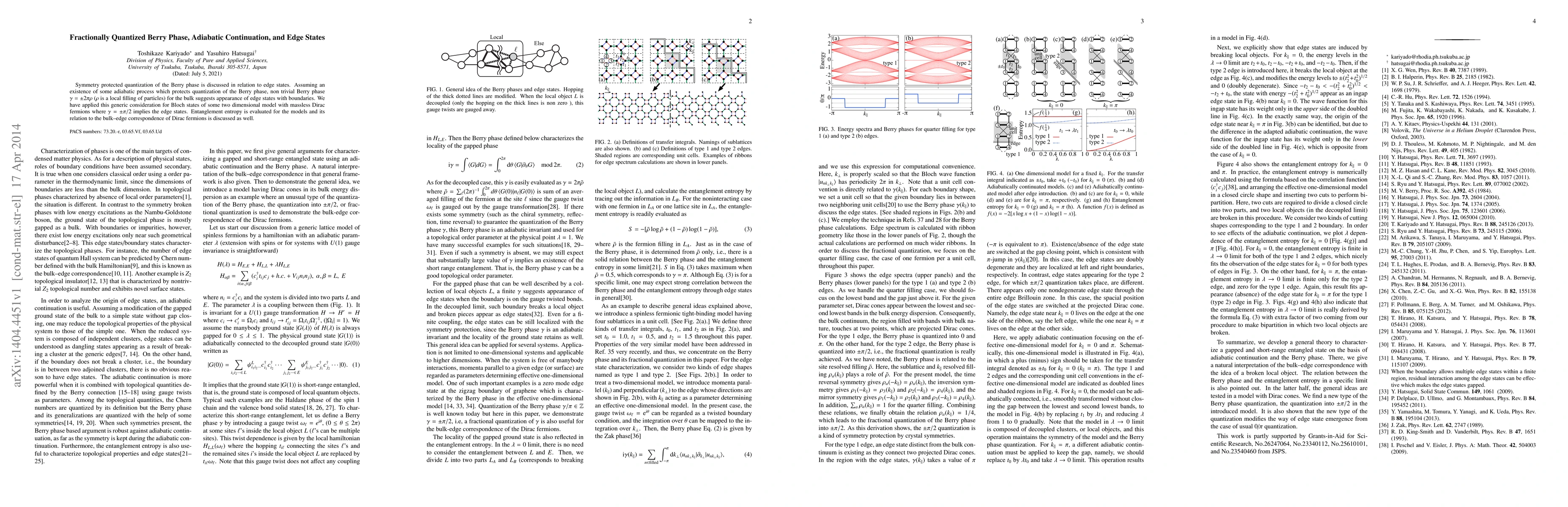 Symmetry protected quantization of the Berry phase is discussed in relation to edge states. Assuming an existence of some adiabatic process which protects quantization of the Berry phase, non trivial Berry phase $\gamma=\pm 2\pi\rho$ ($\rho$ is a local filling of particles) for the bulk suggests appearance of edge states with boundaries. We have applied this generic consideration for Bloch states of some two dimensional model with massless Dirac fermions where $\gamma=\pm\pi/2$ implies the edge states. Entanglement entropy is evaluated for the models and its relation to the bulk-edge correspondence of Dirac fermions is discussed as well.
