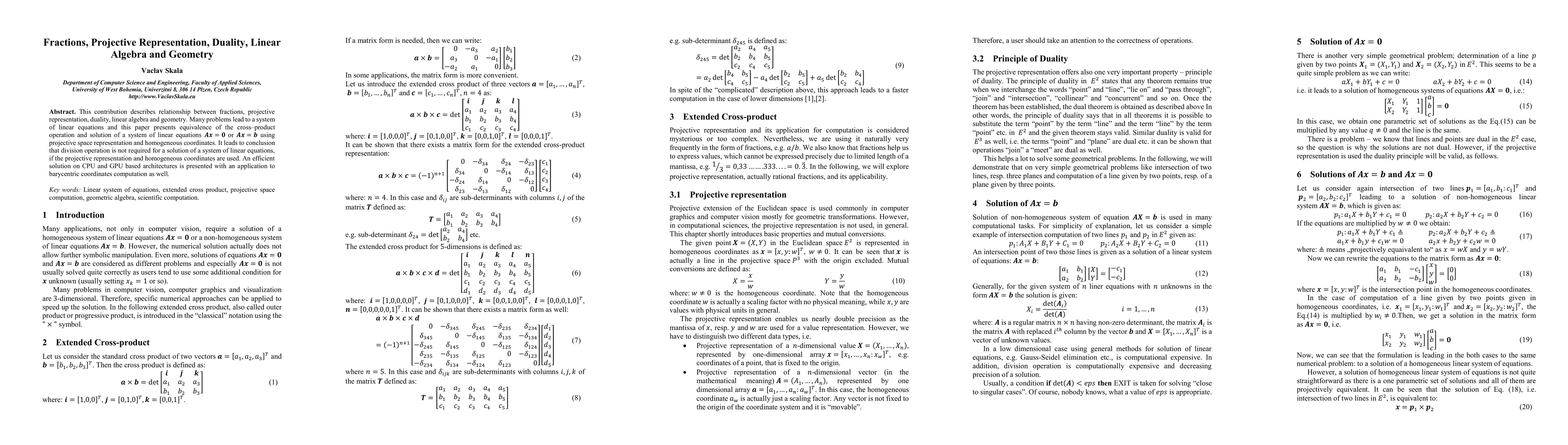 This contribution describes relationship between fractions, projective representation, duality, linear algebra and geometry. Many problems lead to a system of linear equations. This paper presents equivalence of the Cross-product operation and solution of a system of linear equations Ax=0 or Ax=b using projective space representation and homogeneous coordinates. It leads to conclusion that division operation is not required for a solution of a system of linear equations, if the projective representation and homogeneous coordinates are used. An efficient solution on CPU and GPU based architectures is presented with an application to barycentric coordinates computation as well.