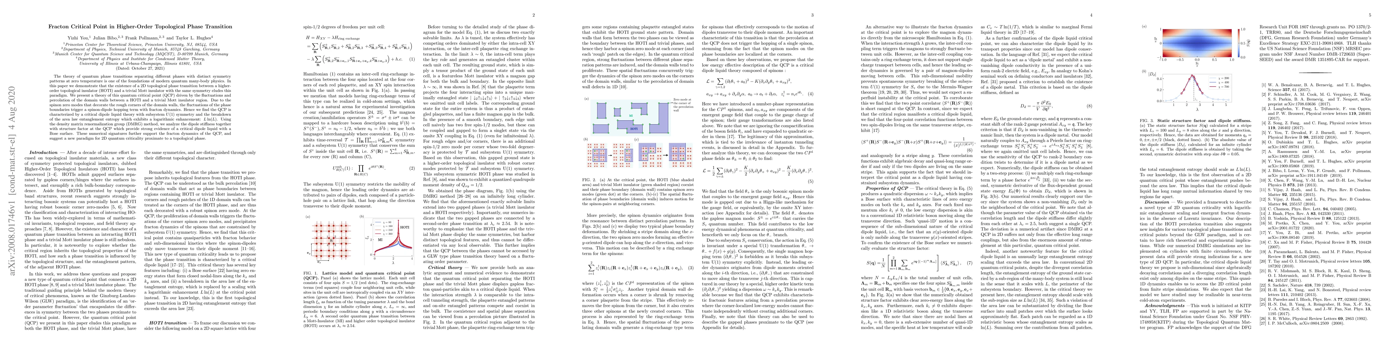 This paper introduces a novel quantum critical point (QCP) in a 2D topological phase transition between a higher-order topological insulator and a trivial Mott insulator, characterized by fracton dynamics and a critical dipole liquid theory. The study reveals a logarithmic enhancement in entanglement entropy and supports the theory with DMRG analysis, suggesting a new paradigm for 2D quantum criticality.