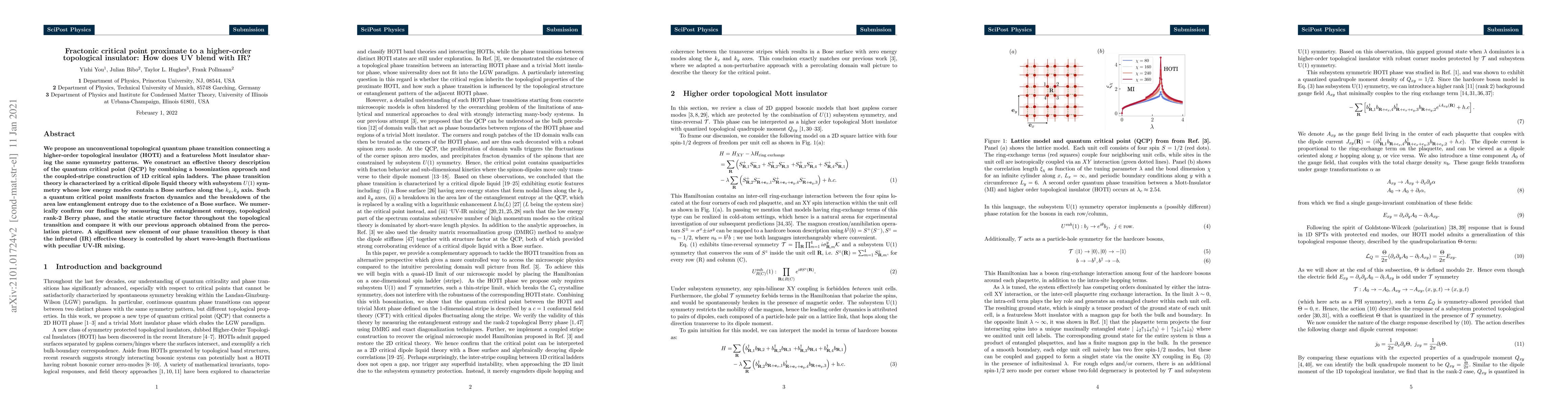 This paper proposes a novel quantum phase transition between a higher-order topological insulator and a Mott insulator, characterized by a unique fracton critical point. The study combines bosonization and coupled-stripe constructions to describe the transition, revealing UV-IR mixing in the infrared effective theory.