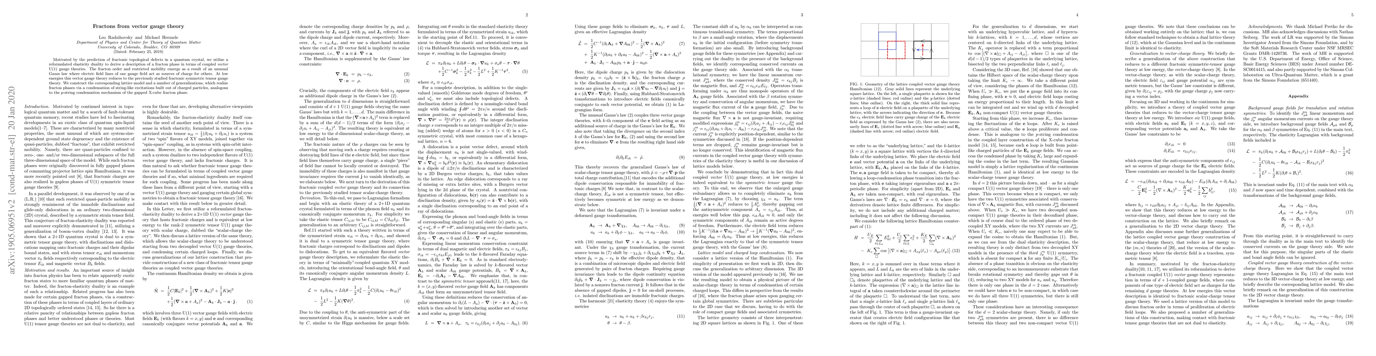 Motivated by the prediction of fractonic topological defects in a quantum crystal, we utilize a reformulated elasticity duality to derive a description of a fracton phase in terms of coupled vector U(1) gauge theories. The fracton order and restricted mobility emerge as a result of an unusual Gauss law where electric field lines of one gauge field act as sources of charge for others. At low energies this vector gauge theory reduces to the previously studied fractonic symmetric tensor gauge theory. We construct the corresponding lattice model and a number of generalizations, which realize fracton phases via a condensation of string-like excitations built out of charged particles, analogous to the p-string condensation mechanism of the gapped X-cube fracton phase.
