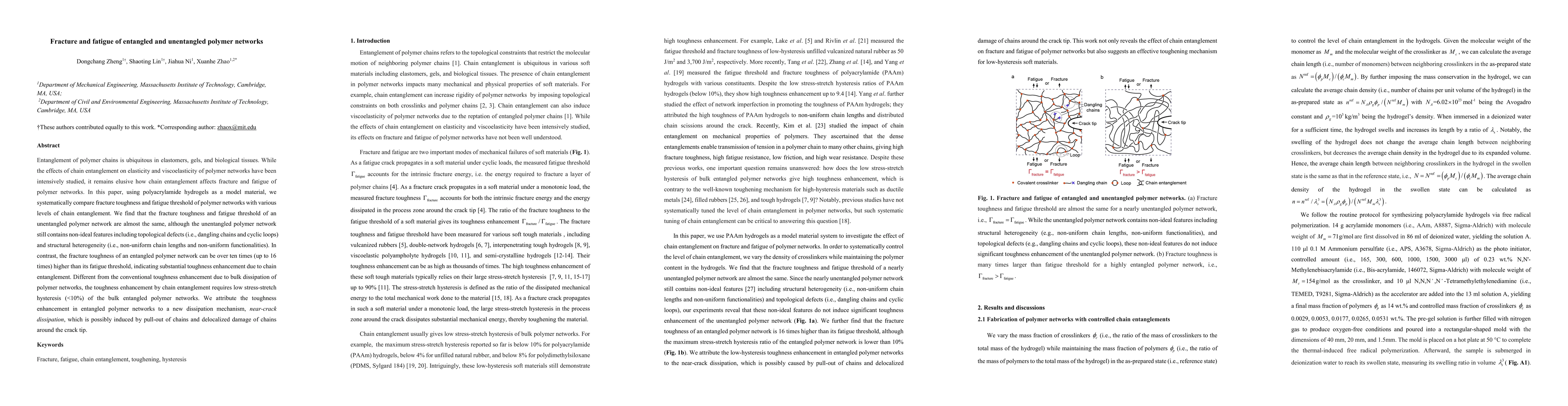 This research investigates how chain entanglement affects the fracture toughness and fatigue threshold of polyacrylamide hydrogels. It finds that entangled networks show significantly higher fracture toughness compared to unentangled ones, attributed to a novel dissipation mechanism called near-crack dissipation, involving chain pull-out and delocalized damage around crack tips.