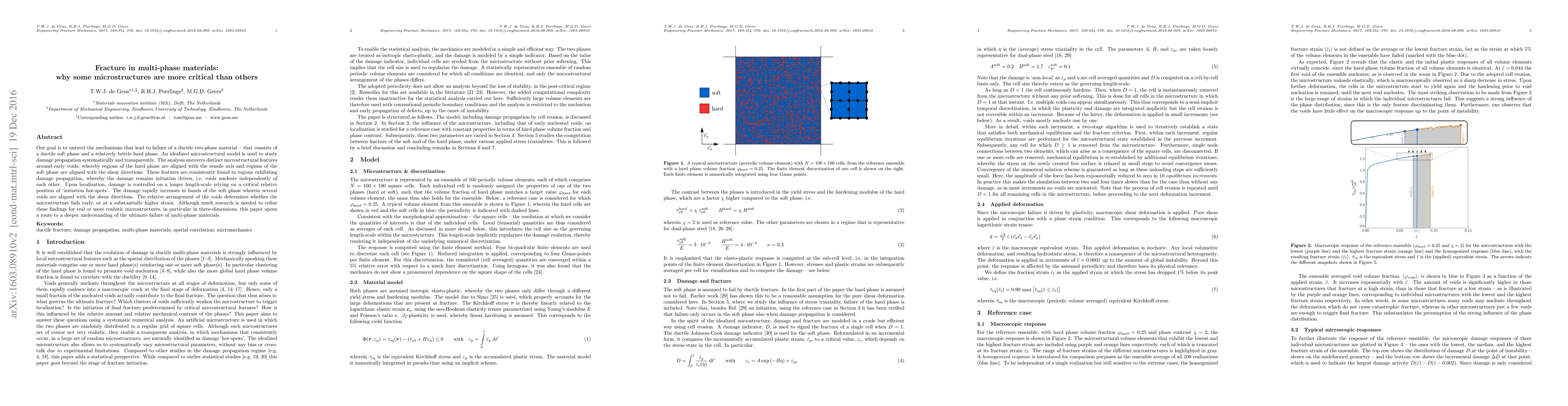This paper investigates the failure mechanisms in ductile two-phase materials, revealing that specific microstructural alignments, particularly of hard and soft phases, critically influence damage propagation and ultimate failure. The study highlights that early failure is often driven by the relative positioning of initiation hot-spots and the alignment of voids in the soft phase along shear directions.