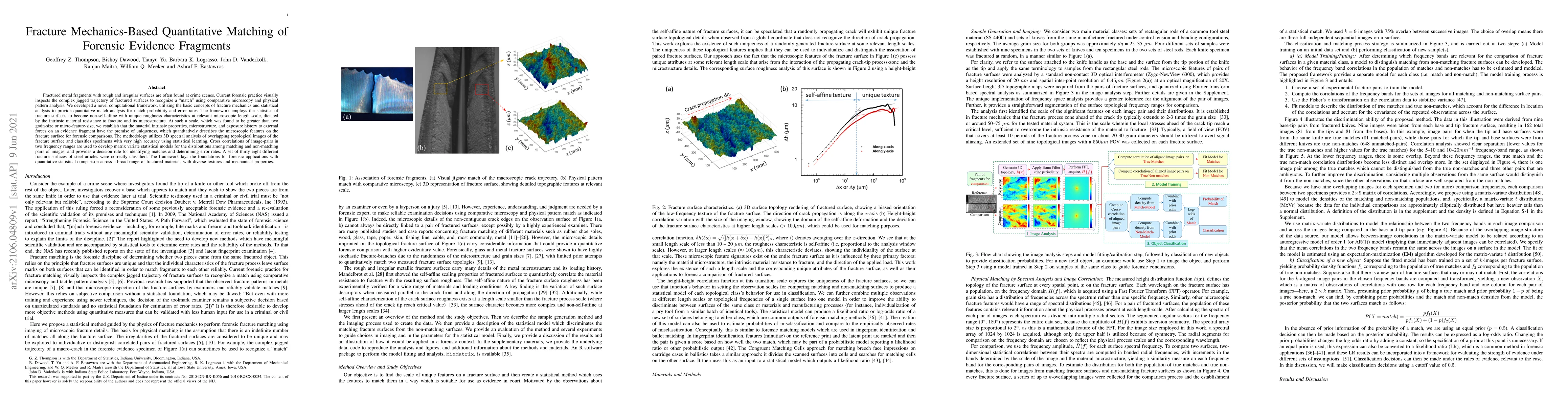This paper introduces a computational framework that applies fracture mechanics and statistical analysis for quantitative matching of fractured metal fragments in forensic investigations. The new method uses 3D spectral analysis and statistical learning to classify fragments with high accuracy, providing a robust decision rule for identifying matches and determining error rates.