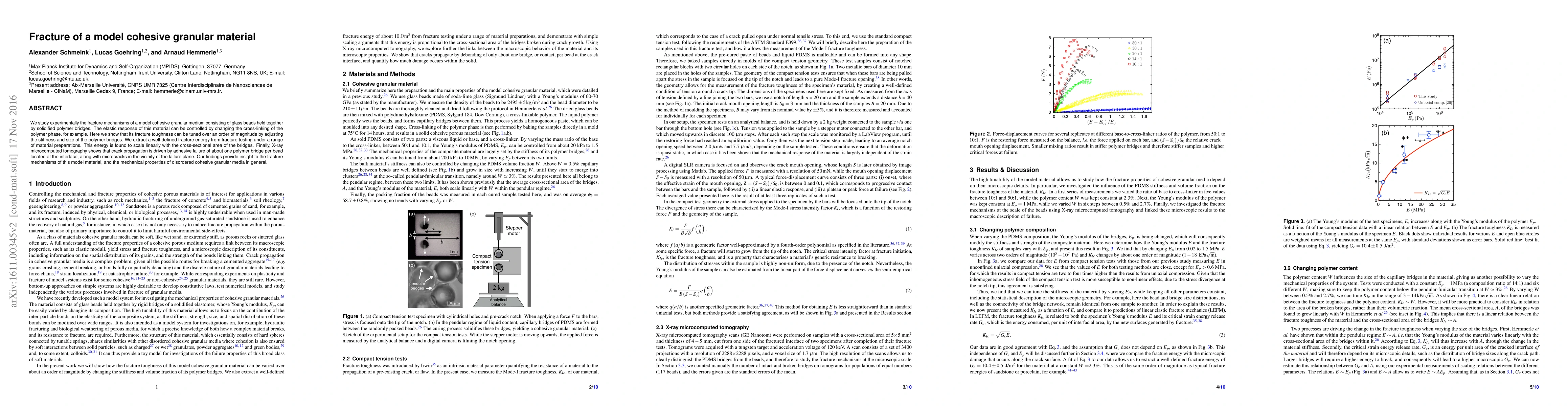 This study experimentally investigates the fracture mechanisms of a cohesive granular medium made of glass beads bonded by polymer bridges. The researchers demonstrate that fracture toughness can be significantly altered by modifying polymer bridge stiffness and size, revealing a linear relationship between fracture energy and bridge cross-sectional area. Crack propagation is shown to primarily occur through adhesive failure of polymer bridges and nearby microcracks.