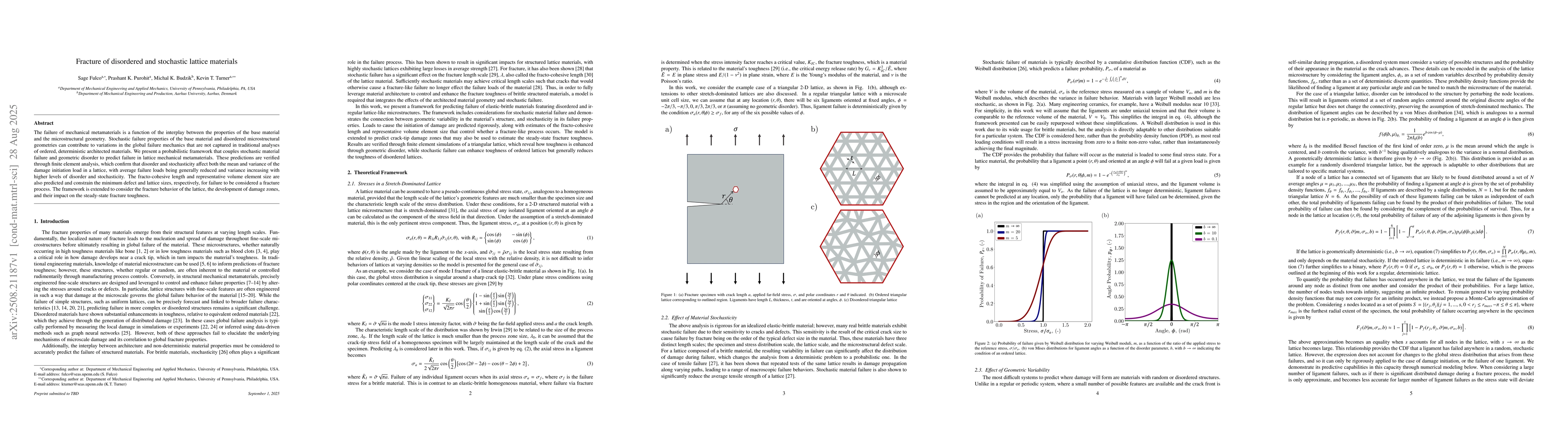 The failure of mechanical metamaterials is a function of the interplay between the properties of the base material and the microstructural geometry. Stochastic failure properties of the base material and disordered microstructural geometries can contribute to variations in the global failure mechanics that are not captured in traditional analyses of ordered, deterministic architected materials. We present a probabilistic framework that couples stochastic material failure and geometric disorder to predict failure in lattice mechanical metamaterials. These predictions are verified through finite element analysis, which confirm that disorder and stochasticity affect both the mean and variance of the damage initiation load in a lattice, with average failure loads being generally reduced and variance increasing with higher levels of disorder and stochasticity. The fracto-cohesive length and representative volume element size are also predicted and constrain the minimum defect and lattice sizes, respectively, for failure to be considered a fracture process. The framework is extended to consider the fracture behavior of the lattice, the development of damage zones, and their impact on the steady-state fracture toughness.