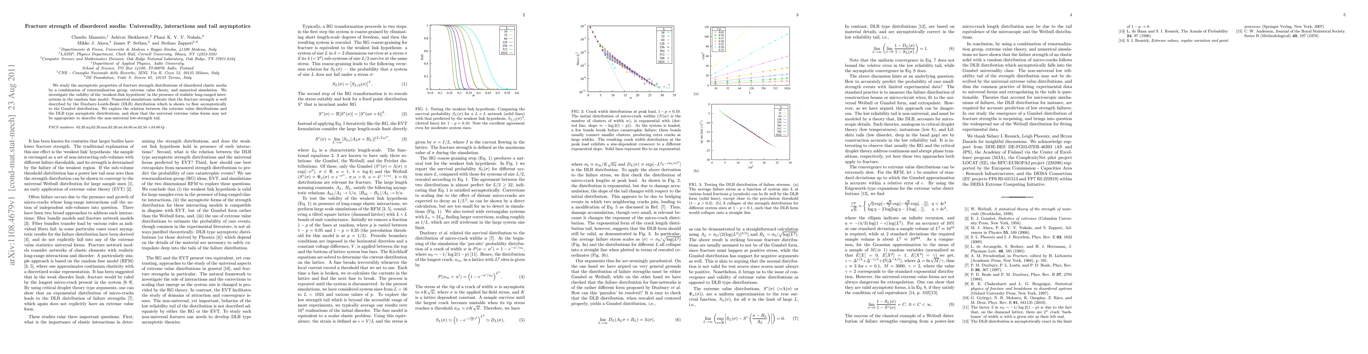 This paper examines the fracture strength in disordered elastic media, combining renormalization group, extreme value theory, and simulations. It finds that the fracture strength follows the Duxbury-Leath-Beale distribution, which converges to the Gumbel distribution, challenging the applicability of universal extreme value forms for non-universal low-strength tails.