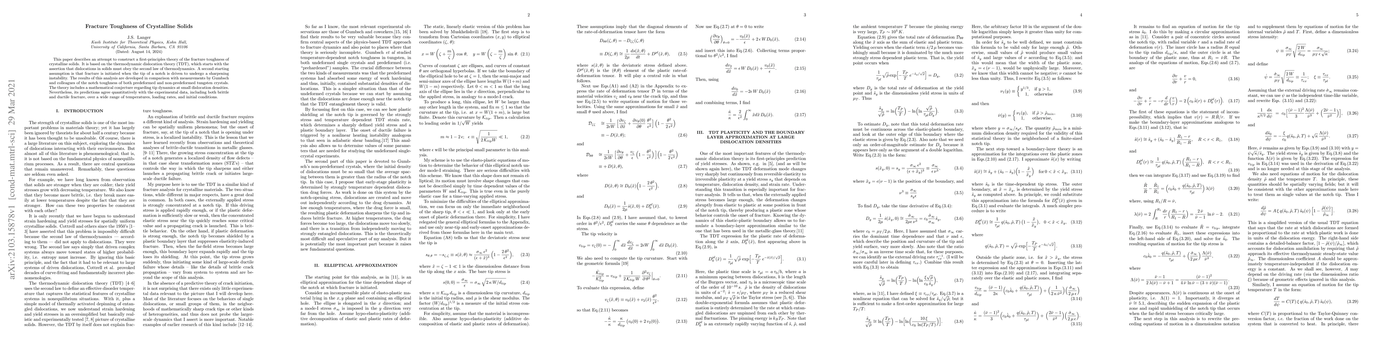 The paper presents a novel first-principles theory for fracture toughness in crystalline solids, incorporating thermodynamic dislocation theory and providing a mathematical description of tip dynamics at small dislocation densities.
