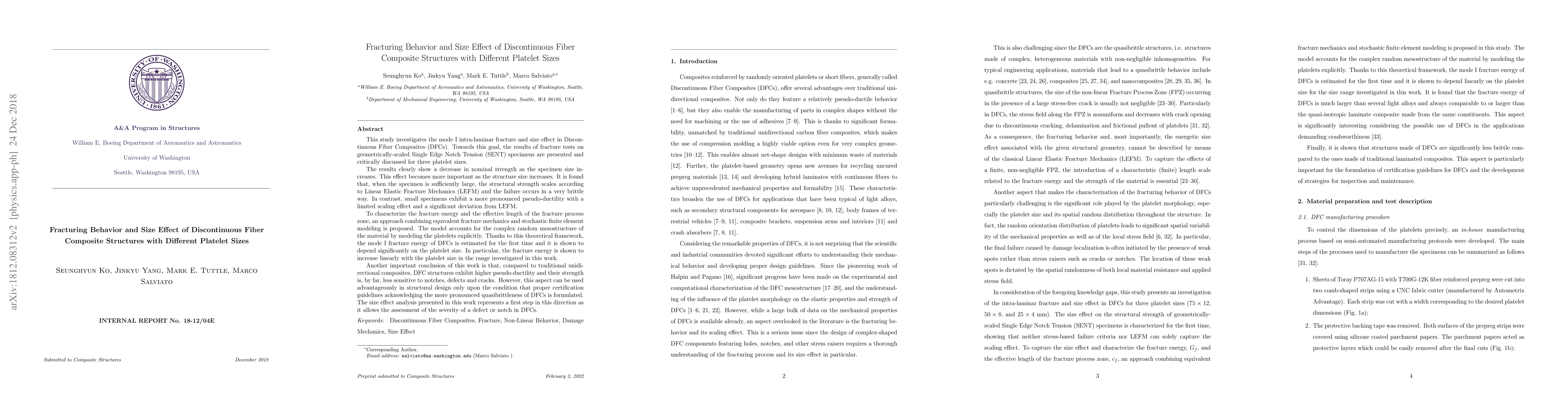 This study investigates the fracture behavior and size effect in Discontinuous Fiber Composites (DFCs) of varying platelet sizes, revealing a decrease in strength with increasing specimen size and a transition from brittle to pseudo-ductile failure. The fracture energy is shown to increase linearly with platelet size, highlighting the importance of material mesostructure in fracture mechanics.