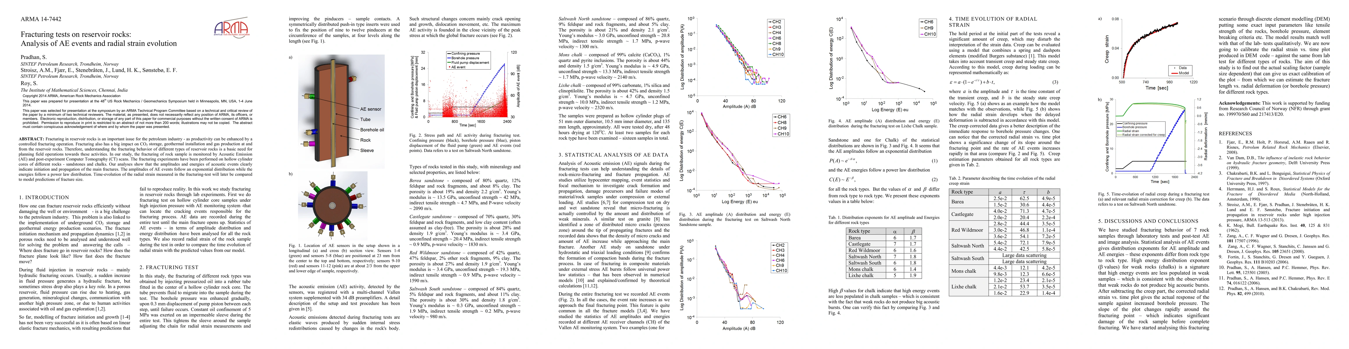 This study investigates the fracturing behavior of reservoir rocks, specifically sandstones and chalks, using Acoustic Emission (AE) monitoring and CT scans. The analysis reveals that AE event amplitudes and energies indicate the initiation and propagation of main fractures, with AE amplitudes following an exponential distribution and energies a power law distribution.