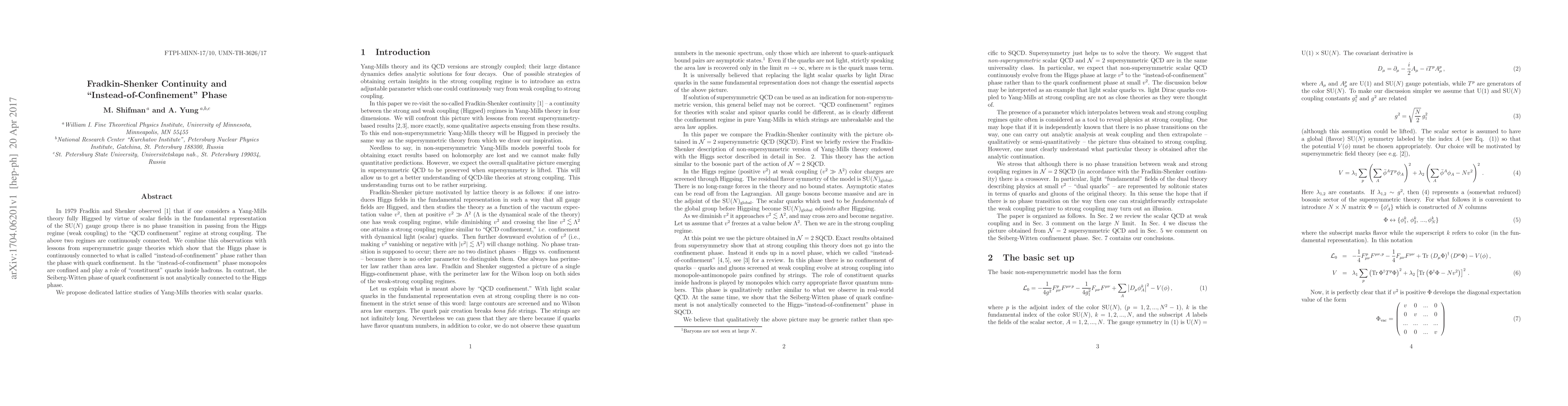 In 1979 Fradkin and Shenker observed \cite{Frad} that if one considers a Yang-Mills theory fully Higgsed by virtue of scalar fields in the fundamental representation of the ${\rm SU}(N)$ gauge group there is no phase transition in passing from the Higgs regime (weak coupling) to the "QCD confinement" regime at strong coupling. The above two regimes are continuously connected. We combine this observations with lessons from supersymmetric gauge theories which show that the Higgs phase is continuously connected to what is called "instead-of-confinement" phase rather than the phase with quark confinement. In the "instead-of-confinement" phase monopoles are confined and play a role of "constituent" quarks inside hadrons. In contrast, the Seiberg-Witten phase of quark confinement is not analytically connected to the Higgs phase. We propose dedicated lattice studies of Yang-Mills theories with scalar quarks.