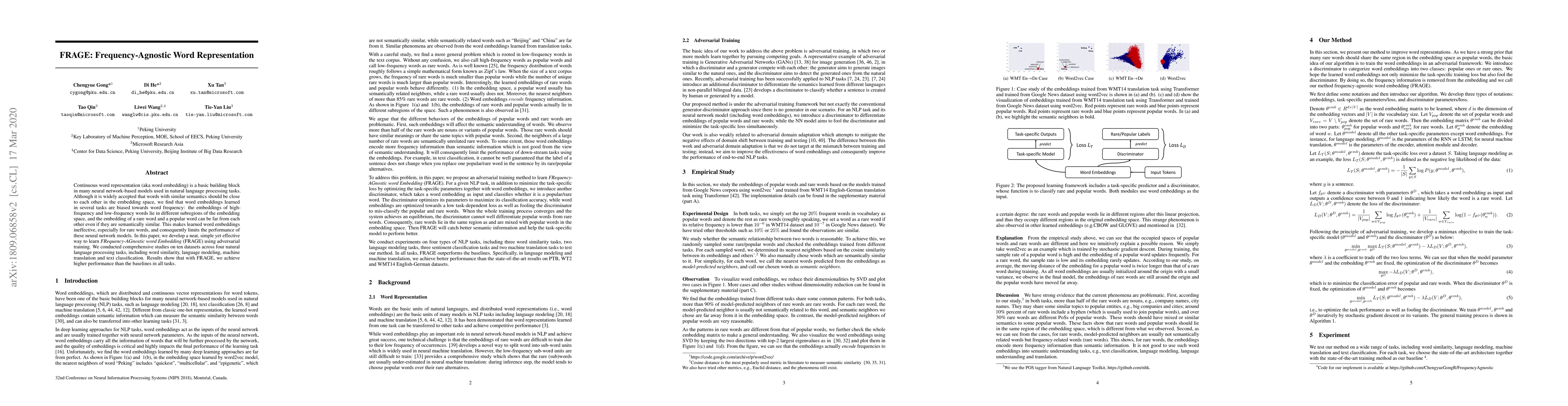 This paper introduces FRAGE, a frequency-agnostic word representation that aims to mitigate the bias in word embeddings towards word frequency. Through adversarial training, FRAGE achieves better performance across various NLP tasks, demonstrating its effectiveness in handling rare words.