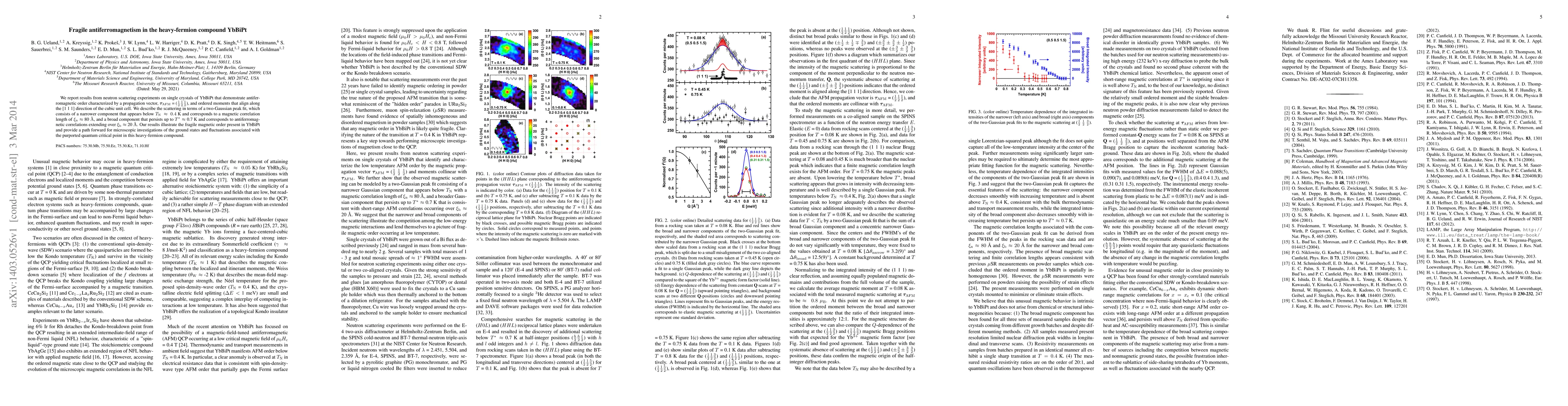 We report results from neutron scattering experiments on single crystals of YbBiPt that demonstrate antiferromagnetic order characterized by a propagation vector, $\tau_{\rm{AFM}}$ = ($\frac{1}{2} \frac{1}{2} \frac{1}{2}$), and ordered moments that align along the [1 1 1] direction of the cubic unit cell. We describe the scattering in terms of a two-Gaussian peak fit, which consists of a narrower component that appears below $T_{\rm{N}}~\approx 0.4$ K and corresponds to a magnetic correlation length of $\xi_{\rm{n}} \approx$ 80 $\rm{\AA}$, and a broad component that persists up to $T^*\approx$ 0.7 K and corresponds to antiferromagnetic correlations extending over $\xi_{\rm{b}} \approx$ 20 $\rm{\AA}$. Our results illustrate the fragile magnetic order present in YbBiPt and provide a path forward for microscopic investigations of the ground states and fluctuations associated with the purported quantum critical point in this heavy-fermion compound.