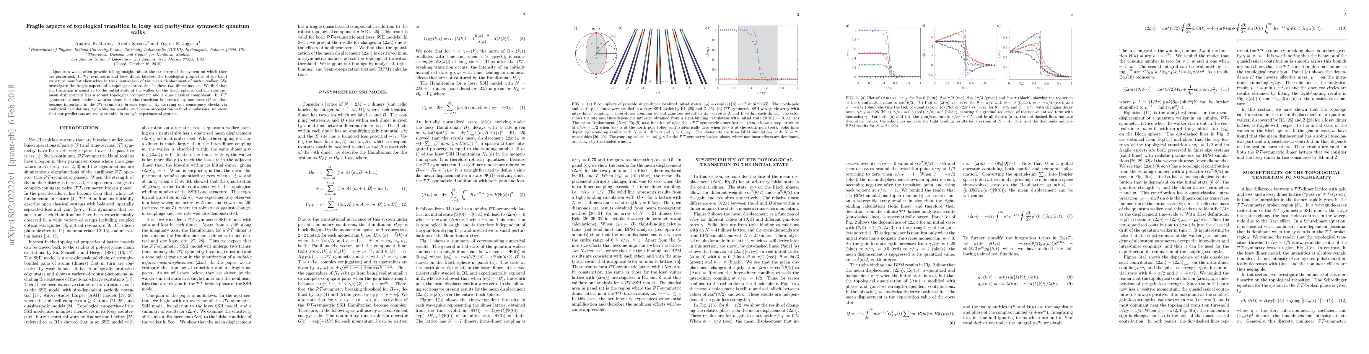 Researchers investigated topological transitions in quantum walks on lossy and parity-time symmetric dimer lattices, finding that these transitions are sensitive to initial states and have robust topological components.