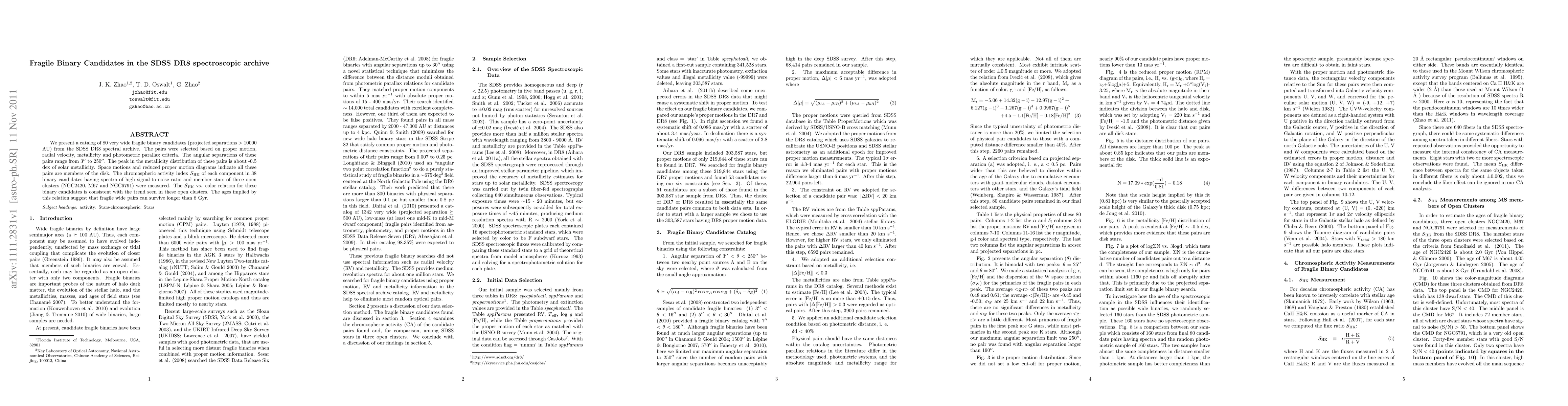We present a catalog of 80 very wide fragile binary candidates (projected separations > 10000 AU) from the SDSS DR8 spectral archive. The pairs were selected based on proper motion, radial velocity, metallicity and photometric parallax criteria. The angular separations of these pairs range from 3" to 250". The peak in the metallicity distribution of these pairs is about -0.5 dex of solar metallicity. Space motions and reduced proper motion diagrams indicate all these pairs are members of the disk. The chromospheric activity index SHK of each component in 38 binary candidates having spectra of high signal-to-noise ratio and member stars of three open clusters (NGC2420, M67 and NGC6791) were measured. The SHK vs. color relation for these binary candidates is consistent with the trend seen in these open clusters. The ages implied by this relation suggest that fragile wide pairs can survive longer than 8 Gyr.