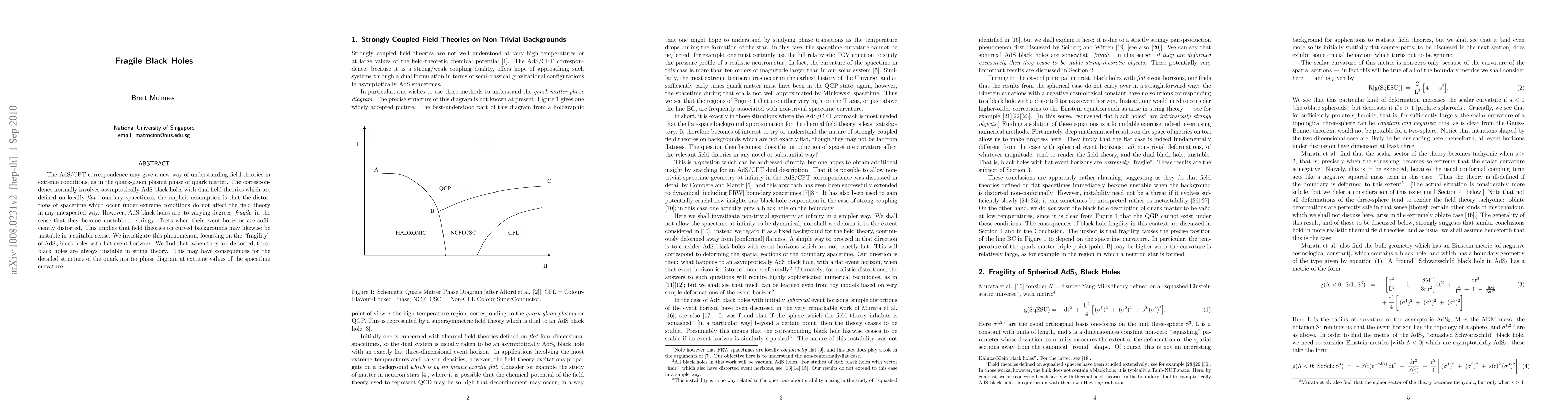 The paper explores the "fragility" of AdS black holes under extreme spacetime distortions, revealing that such distortions lead to instability in string theory. This instability may affect the understanding of field theories in extreme conditions, such as the quark-gluon plasma phase.