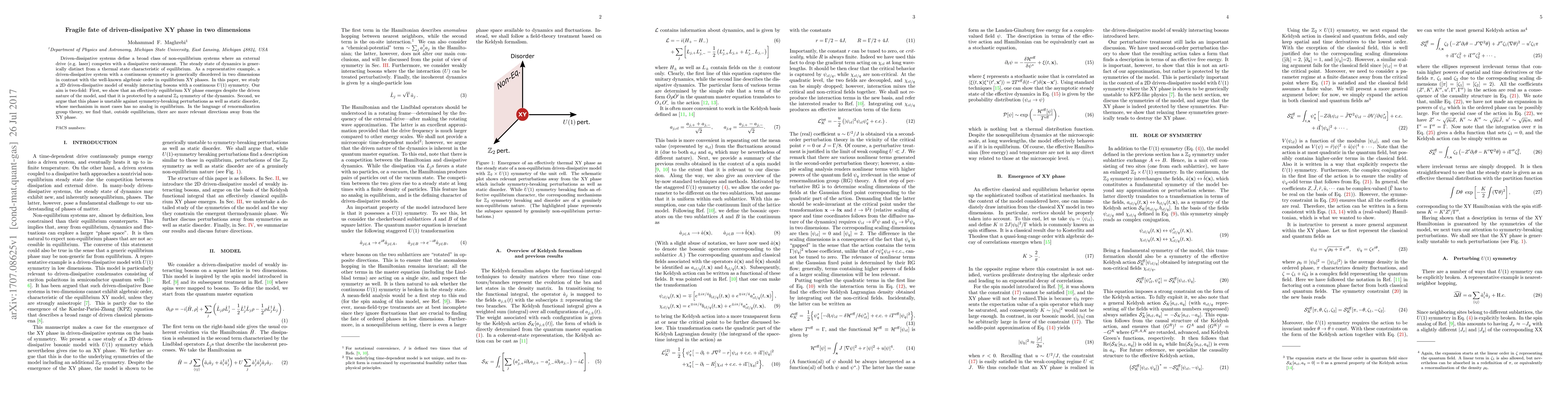 This paper investigates a 2D driven-dissipative model of weakly interacting bosons, demonstrating the emergence of an effectively equilibrium XY phase protected by a ${\mathbb Z}_2$ symmetry, while also showing its fragility against perturbations and disorder due to unique non-equilibrium dynamics.