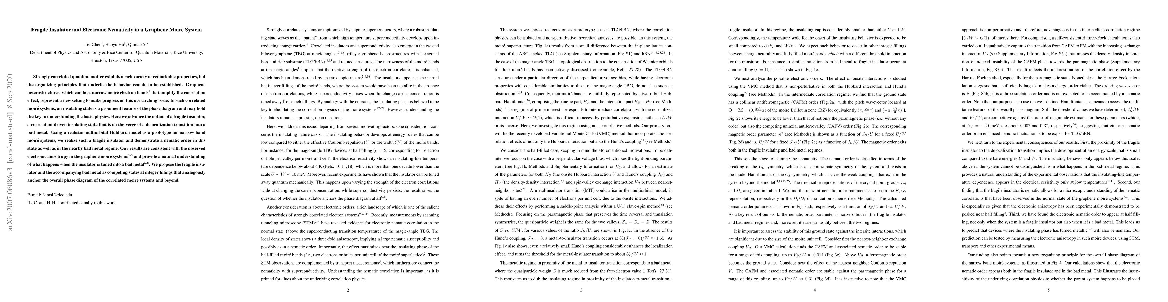 The research introduces the concept of a 'fragile insulator' in graphene moire systems, a correlation-driven insulating state sensitive to delocalization into a bad metal. Utilizing a multiorbital Hubbard model, the study demonstrates nematic order in this fragile insulator and adjacent bad metal regime, providing insights into electronic anisotropy observed in these systems and proposing fragile insulator and bad metal as competing states at integer fillings.