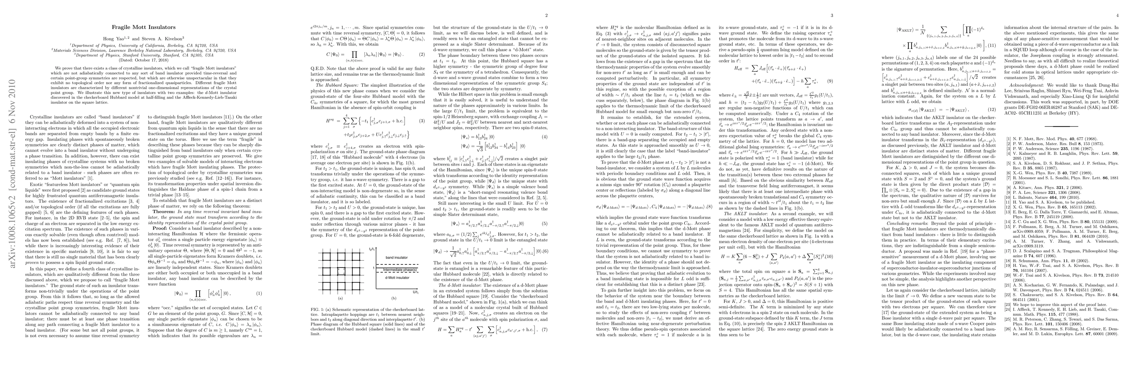 We prove that there exists a class of crystalline insulators, which we call "fragile Mott insulators" which are not adiabatically connected to any sort of band insulator provided time-reversal and certain point-group symmetries are respected, but which are otherwise unspectacular in that they exhibit no topological order nor any form of fractionalized quasiparticles. Different fragile Mott insulators are characterized by different nontrivial one-dimensional representations of the crystal point group. We illustrate this new type of insulators with two examples: the d-Mott insulator discovered in the checkerboard Hubbard model at half-filling and the Affleck-Kennedy-Lieb-Tasaki insulator on the square lattice.