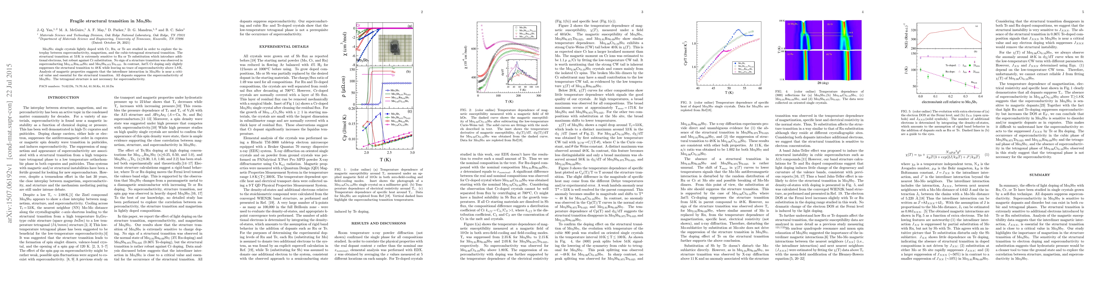 Mo$_3$Sb$_7$ single crystals lightly doped with Cr, Ru, or Te are studied in order to explore the interplay between superconductivity, magnetism, and the cubic-tetragonal structural transition. The structural transition at 53\,K is extremely sensitive to Ru or Te substitution which introduce additional electrons, but robust against Cr substitution. No sign of a structure transition was observed in superconducting Mo$_{2.91}$Ru$_{0.09}$Sb$_7$ and Mo$_3$Sb$_{6.975}$Te$_{0.025}$. In contrast, 3at\% Cr doping only slightly suppresses the structural transition to 48\,K while leaving no trace of superconductivity above 1.8\,K. Analysis of magnetic properties suggests that the interdimer interaction in Mo$_3$Sb$_7$ is near a critical value and essential for the structural transition. All dopants suppress the superconductivity of Mo$_3$Sb$_7$. The tetragonal structure is not necessary for superconductivity.