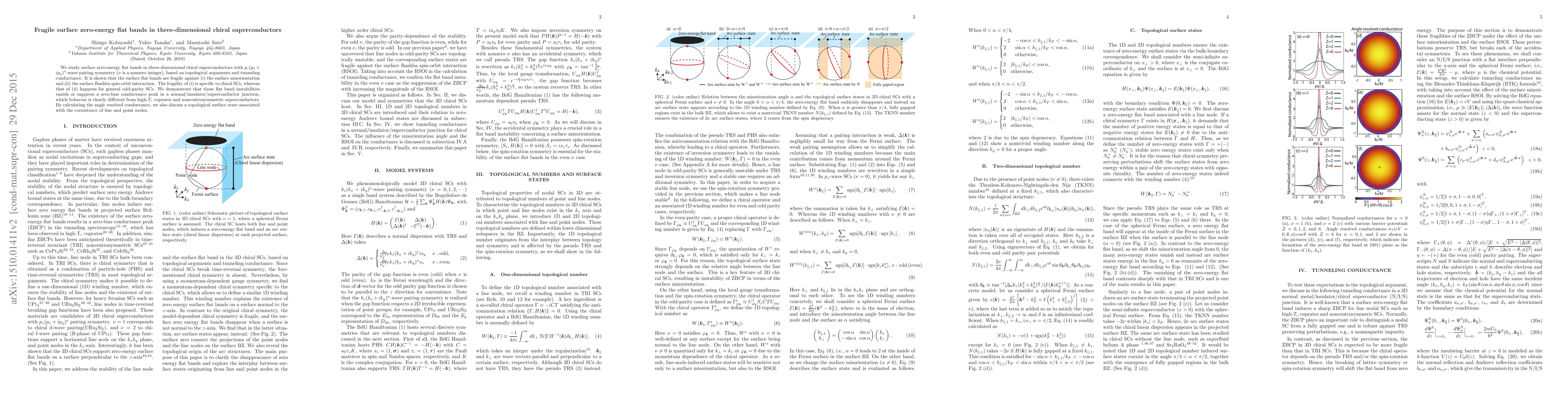 We study surface zero-energy flat bands in three-dimensional chiral superconductors with $p_z (p_x +ip_y)^{\nu}$-wave pairing symmetry ($\nu$ is a nonzero integer), based on topological numbers and tunneling conductance. It is shown that the surface flat bands are fragile against (i) the misorientation angle and (ii) surface Rashba spin-orbit interaction. The fragility of (i) is specific to chiral SCs, whereas that of (ii) happens for general odd-parity SCs. We demonstrate that these flat band instabilities vanish or suppress a zero-bias conductance peak in a normal/insulator/superconductor junction, which behavior is clearly different from high-$T_c$ cuprates and noncentrosymmetric superconductors. By calculating the angle resolved conductance, we also discuss a topological surface state associated with the coexistence of line and point nodes.