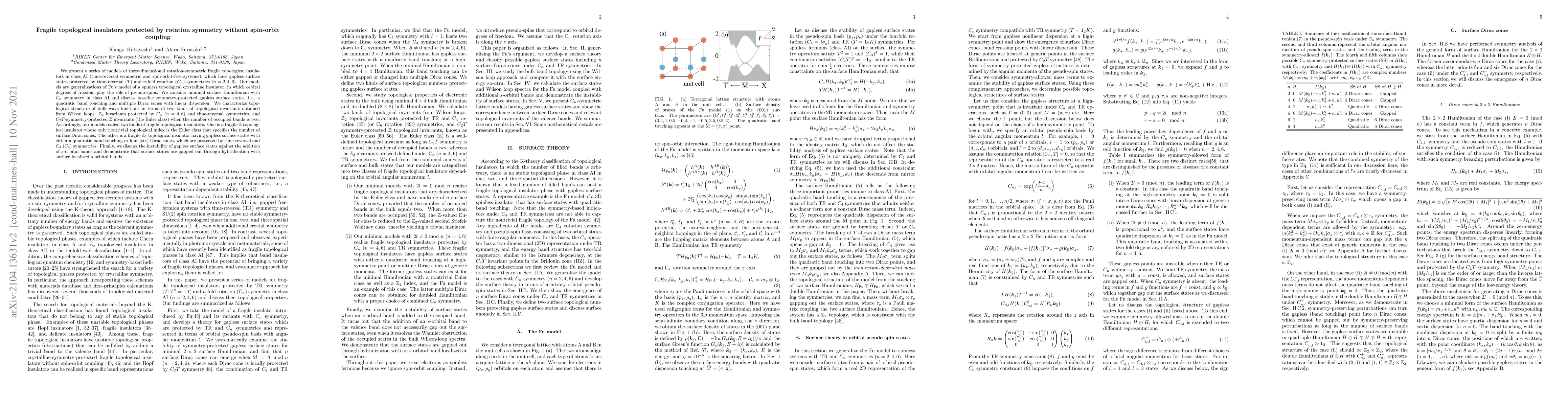 We present a series of models of three-dimensional rotation-symmetric fragile topological insulators in class AI (time-reversal symmetric and spin-orbit-free systems), which have gapless surface states protected by time-reversal ($T$) and $n$-fold rotation ($C_n$) symmetries ($n=2,4,6$). Our models are generalizations of Fu's model of a spinless topological crystalline insulator, in which orbital degrees of freedom play the role of pseudo-spins. We consider minimal surface Hamiltonian with $C_n$ symmetry in class AI and discuss possible symmetry-protected gapless surface states, i.e., a quadratic band touching and multiple Dirac cones with linear dispersion. We characterize topological structure of bulk wave functions in terms of two kinds of topological invariants obtained from Wilson loops: $\mathbb{Z}_2$ invariants protected by $C_n$ ($n=4,6$) and time-reversal symmetries, and $C_2T$-symmetry-protected $\mathbb{Z}$ invariants (the Euler class) when the number of occupied bands is two. Accordingly, our models realize two kinds of fragile topological insulators. One is a fragile $\mathbb{Z}$ topological insulator whose only nontrivial topological index is the Euler class that specifies the number of surface Dirac cones. The other is a fragile $\mathbb{Z}_2$ topological insulator having gapless surface states with either a quadratic band touching or four (six) Dirac cones, which are protected by time-reversal and $C_4$ ($C_6$) symmetries. Finally, we discuss the instability of gapless surface states against the addition of $s$-orbital bands and demonstrate that surface states are gapped out through hybridization with surface-localized $s$-orbital bands.