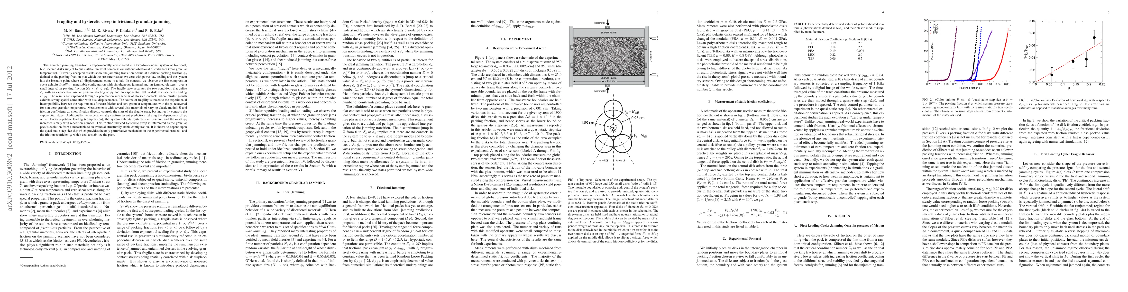 The paper investigates the granular jamming transition in frictional, bi-dispersed disks, revealing a fragile metastable state with simultaneous jammed and un-jammed clusters between certain packing fractions. It finds that friction influences the onset of the fragile state but not the exponential slope, and demonstrates hysteretic creep under repetitive loading linked to friction coefficient and quasi-static step size.