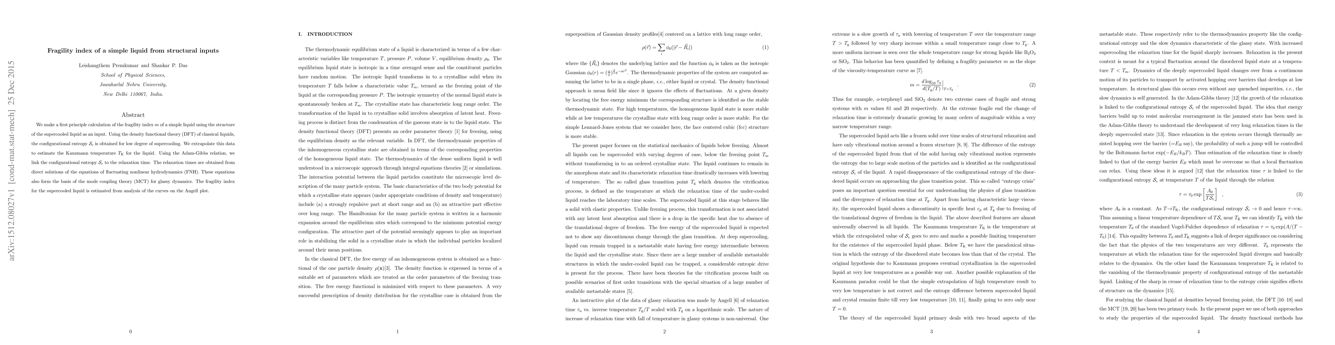 This paper calculates the fragility index $m$ of a simple liquid using density functional theory and structural data from supercooled liquids. It links configurational entropy to relaxation time via the Adam-Gibbs relation and estimates the Kauzmann temperature, ultimately determining the fragility index from the Angell plot analysis.