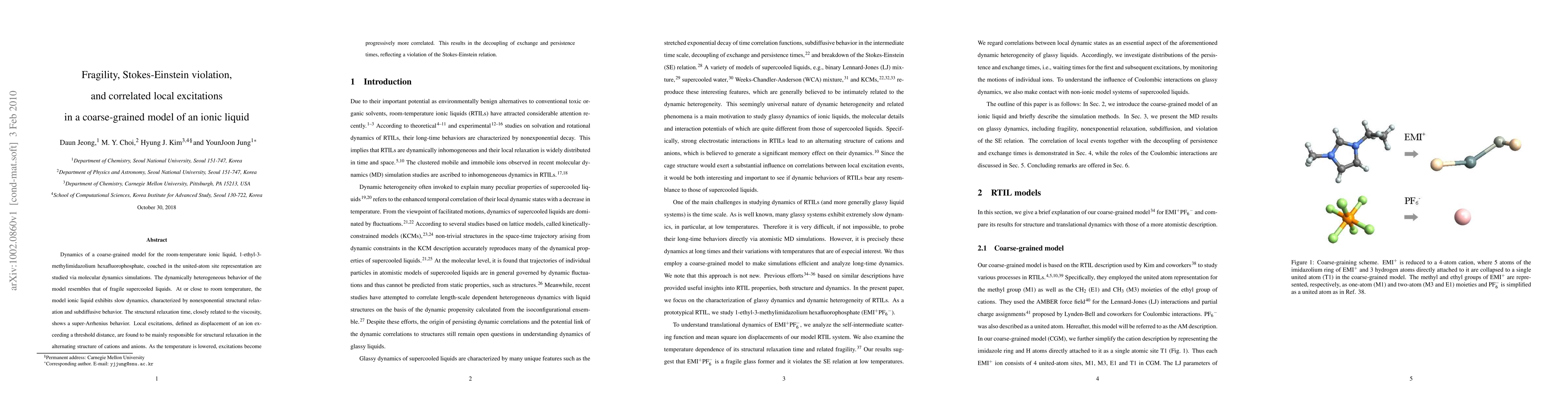 This study investigates the dynamics of a coarse-grained model of the ionic liquid 1-ethyl-3-methylimidazolium hexafluorophosphate, revealing fragile, supercooled-like behavior and nonexponential structural relaxation. Local excitations, particularly in ion displacements, drive structural relaxation, with increased correlation at lower temperatures leading to a Stokes-Einstein relation violation.