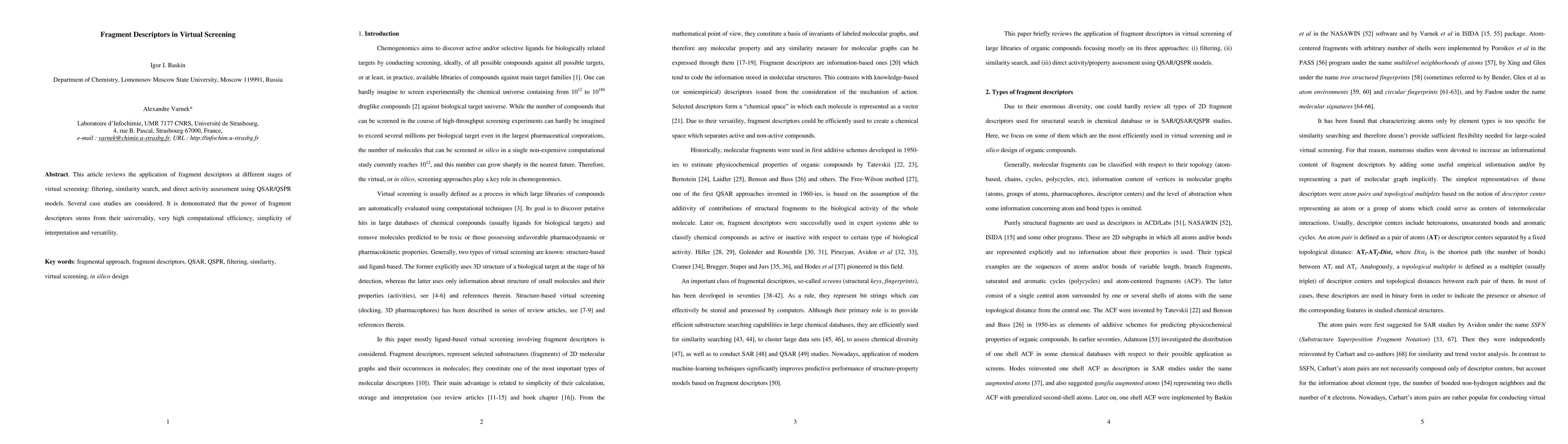 This paper reviews the use of fragment descriptors in virtual screening, highlighting their efficiency and utility in filtering, similarity search, and QSAR/QSPR models. Case studies show their versatility and ease of interpretation.