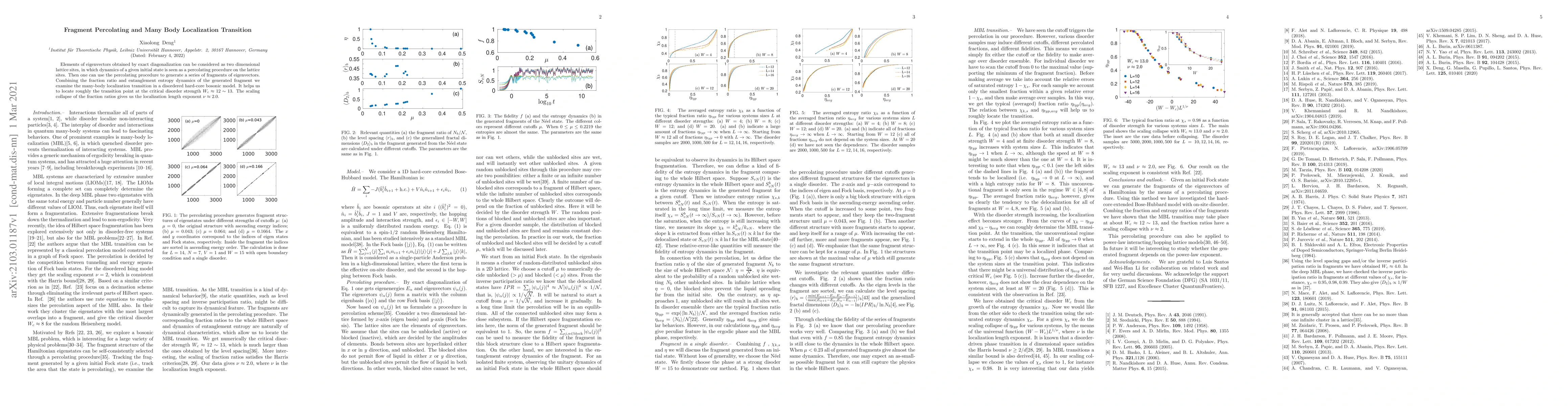 Elements of eigenvectors obtained by exact diagonalization can be considered as two dimensional lattice sites, in which dynamics of a given initial state is seen as a percolating procedure on the lattice sites. Then one can use the percolating procedure to generate a series of fragments of eigenvectors. Combining the fraction ratio and entanglement entropy dynamics of the generated fragment we examine the many-body localization transition in a disordered hard-core bosonic model. It helps us to locate roughly the transition point at the critical disorder strength $W_c\approx 12\sim13$. The scaling collapse of the fraction ratios gives us the localization length exponent $\nu\approx2.0$.