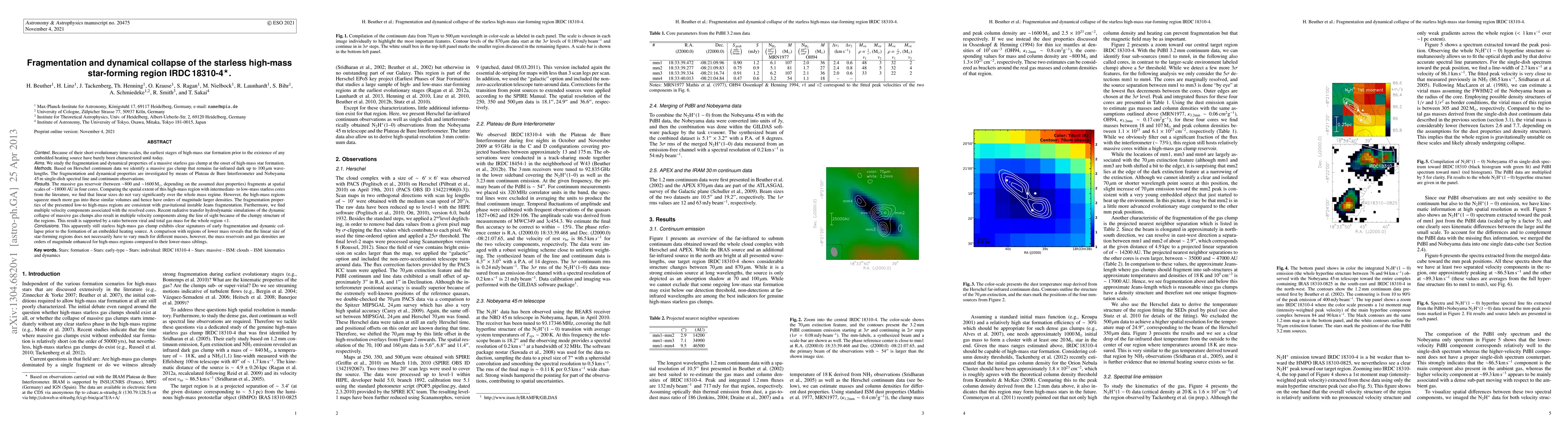 Aims: We study the fragmentation and dynamical properties of a massive starless gas clump at the onset of high-mass star formation. Methods: Based on Herschel continuum data we identify a massive gas clump that remains far-infrared dark up to 100mum wavelengths. The fragmentation and dynamical properties are investigated by means of Plateau de Bure Interferometer and Nobeyama 45m single-dish spectral line and continuum observations. Results: The massive gas reservoir fragments at spatial scales of ~18000AU in four cores. Comparing the spatial extent of this high-mass region with intermediate- to low-mass starless cores from the literature, we find that linear sizes do not vary significantly over the whole mass regime. However, the high-mass regions squeeze much more gas into these similar volumes and hence have orders of magnitude larger densities. The fragmentation properties of the presented low-to high-mass regions are consistent with gravitational instable Jeans fragmentation. Furthermore, we find multiple velocity components associated with the resolved cores. Recent radiative transfer hydrodynamic simulations of the dynamic collapse of massive gas clumps also result in multiple velocity components along the line of sight because of the clumpy structure of the regions. This result is supported by a ratio between viral and total gas mass for the whole region <1. Conclusions: This apparently still starless high-mass gas clump exhibits clear signatures of early fragmentation and dynamic collapse prior to the formation of an embedded heating source. A comparison with regions of lower mass reveals that the linear size of star-forming regions does not necessarily have to vary much for different masses, however, the mass reservoirs and gas densities are orders of magnitude enhanced for high-mass regions compared to their lower-mass siblings.