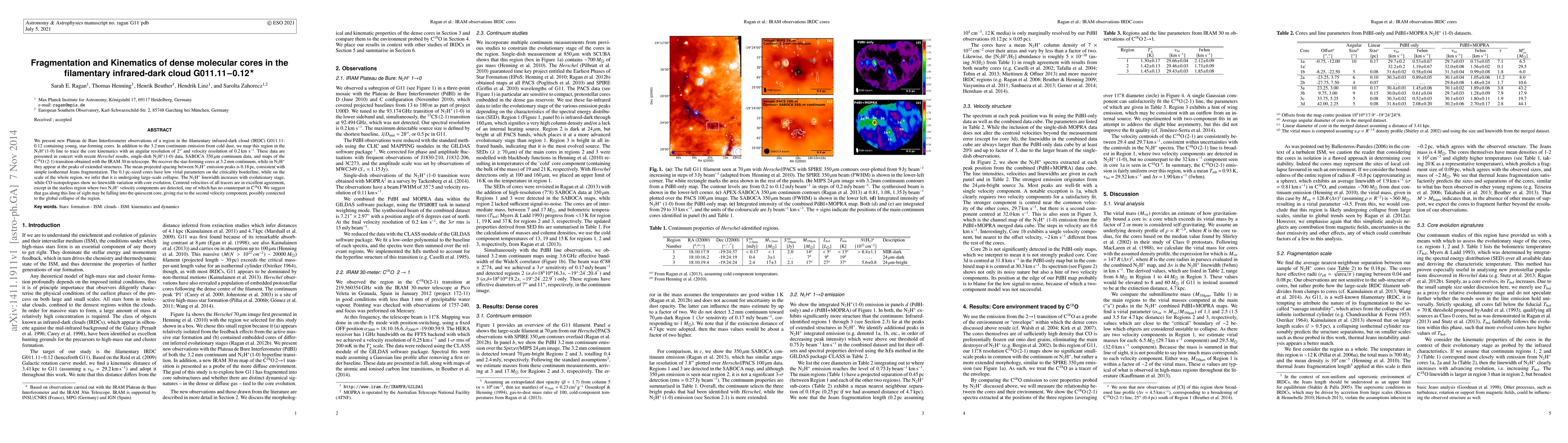 We present new Plateau de Bure Interferometer observations of a region in the filamentary infrared-dark cloud (IRDC) G011.11-0.12 containing young, star-forming cores. In addition to the 3.2mm continuum emission from cold dust, we map this region in the N$_2$H$^+$(1-0) line to trace the core kinematics with an angular resolution of 2" and velocity resolution of 0.2km s$^{-1}$. These data are presented in concert with recent {\em Herschel} results, single-dish N$_2$H$^+$(1-0) data, SABOCA 350$\mu$m continuum data, and maps of the C$^{18}$O (2-1) transition obtained with the IRAM 30m telescope. We recover the star-forming cores at 3.2mm continuum, while in N$_2$H$^+$ they appear at the peaks of extended structures. The mean projected spacing between N$_2$H$^+$ emission peaks is 0.18pc, consistent with simple isothermal Jeans fragmentation. The 0.1pc-sized cores have low virial parameters on the criticality borderline, while on the scale of the whole region, we infer that it is undergoing large-scale collapse. The N$_2$H$^+$ linewidth increases with evolutionary stage, while CO isotopologues show no linewidth variation with core evolution. Centroid velocities of all tracers are in excellent agreement, except in the starless region where two N$_2$H$^+$ velocity components are detected, one of which has no counterpart in C$^{18}$O. We suggest that gas along this line of sight may be falling into the quiescent core, giving rise to the second velocity component, possibly connected to the global collapse of the region.