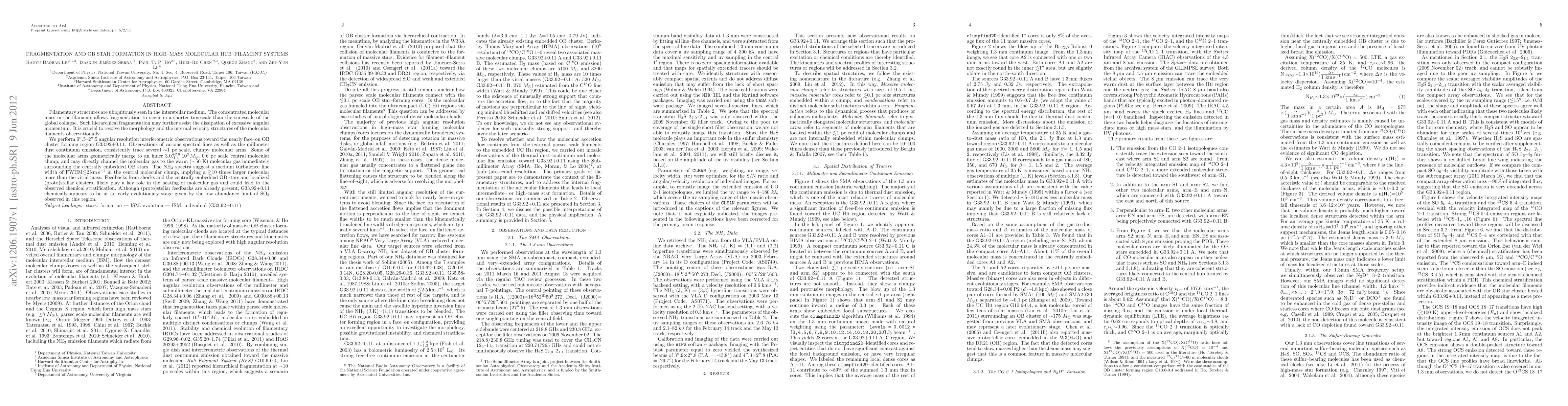 Filamentary structures are ubiquitously seen in the interstellar medium. The concentrated molecular mass in the filaments allows fragmentation to occur in a shorter timescale than the timescale of the global collapse. Such hierarchical fragmentation may further assist the dissipation of excessive angular momentum. It is crucial to resolve the morphology and the internal velocity structures of the molecular filaments observationally. We perform 0".5-2".5 angular resolution interferometric observations toward the nearly face-on OB cluster forming region G33.92+0.11. Observations of various spectral lines as well as the millimeter dust continuum emission, consistently trace several $\sim$1 pc scale, clumpy molecular arms. Some of the molecular arms geometrically merge to an inner 3.0$^{{\scriptsize{+2.8}}}_{{-\scriptsize{1.4}}}\cdot10^{3}$\,$M_{\odot}$, 0.6 pc scale central molecular clump, and may directly channel the molecular gas to the warm ($\sim$50 K) molecular gas immediately surrounding the centrally embedded OB stars. The NH$_{3}$ spectra suggest a medium turbulence line width of FWHM$\lesssim$2\,km\,s$^{-1}$ in the central molecular clump, implying a $\gtrsim$10 times larger molecular mass than the virial mass. Feedbacks from shocks and the centrally embedded OB stars and localized (proto)stellar clusters, likely play a key role in the heating of molecular gas and could lead to the observed chemical stratification. Although (proto)stellar feedbacks are already present, G33.92+0.11 chemically appears to be at an early evolutionary stage given by the low abundance limit of SO$_{2}$ observed in this region.