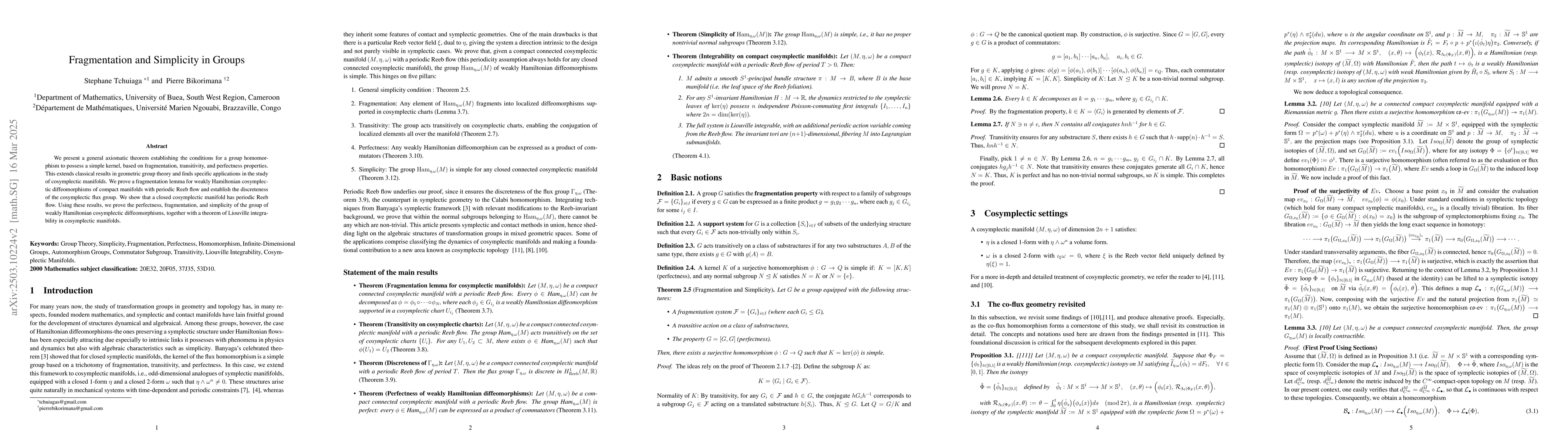 The research employs an axiomatic approach, establishing conditions for group homomorphisms to have simple kernels through fragmentation, transitivity, and perfectness properties. It extends classical results in geometric group theory and applies to cosymplectic manifolds, proving fragmentation, discreteness of cosymplectic flux groups, and perfectness of weakly Hamiltonian cosymplectic diffeomorphism groups.