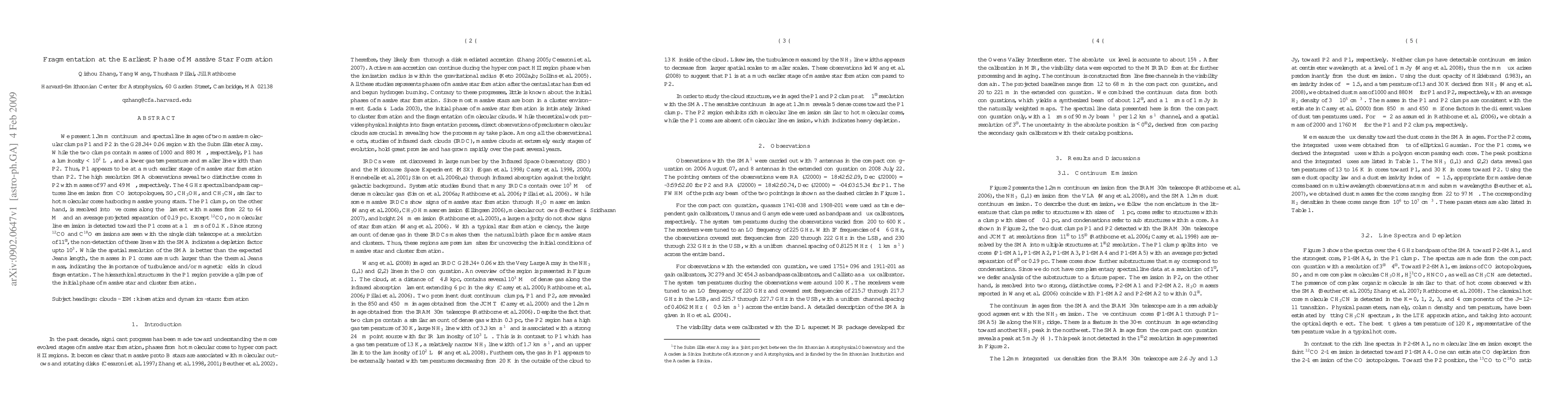 We present 1.3mm continuum and spectral line images of two massive molecular clumps P1 and P2 in the G28.34+0.06 region with the Submillimeter Array. While the two clumps contain masses of 1000 and 880 \msun, respectively, P1 has a luminosity $< 10^2$ \lsun, and a lower gas temperature and smaller line width than P2. Thus, P1 appears to be at a much earlier stage of massive star formation than P2. The high resolution SMA observations reveal two distinctive cores in P2 with masses of 97 and 49 \msun, respectively. The 4 GHz spectral bandpass captures line emission from CO isotopologues, SO, CH$_3$OH, and CH$_3$CN, similar to hot molecular cores harboring massive young stars. The P1 clump, on the other hand, is resolved into five cores along the filament with masses from 22 to 64 \msun and an average projected separation of 0.19 pc. Except $^{12}$CO, no molecular line emission is detected toward the P1 cores at a 1$\sigma$ rms of 0.1 K. Since strong $^{12}$CO and C$^{18}$O emissions are seen with the single dish telescope at a resolution of 11$''$, the non-detection of these lines with the SMA indicates a depletion factor upto $10^3$. While the spatial resolution of the SMA is better than the expected Jeans length, the masses in P1 cores are much larger than the thermal Jeans mass, indicating the importance of turbulence and/or magnetic fields in cloud fragmentation. The hierarchical structures in the P1 region provide a glimpse of the initial phase of massive star and cluster formation.